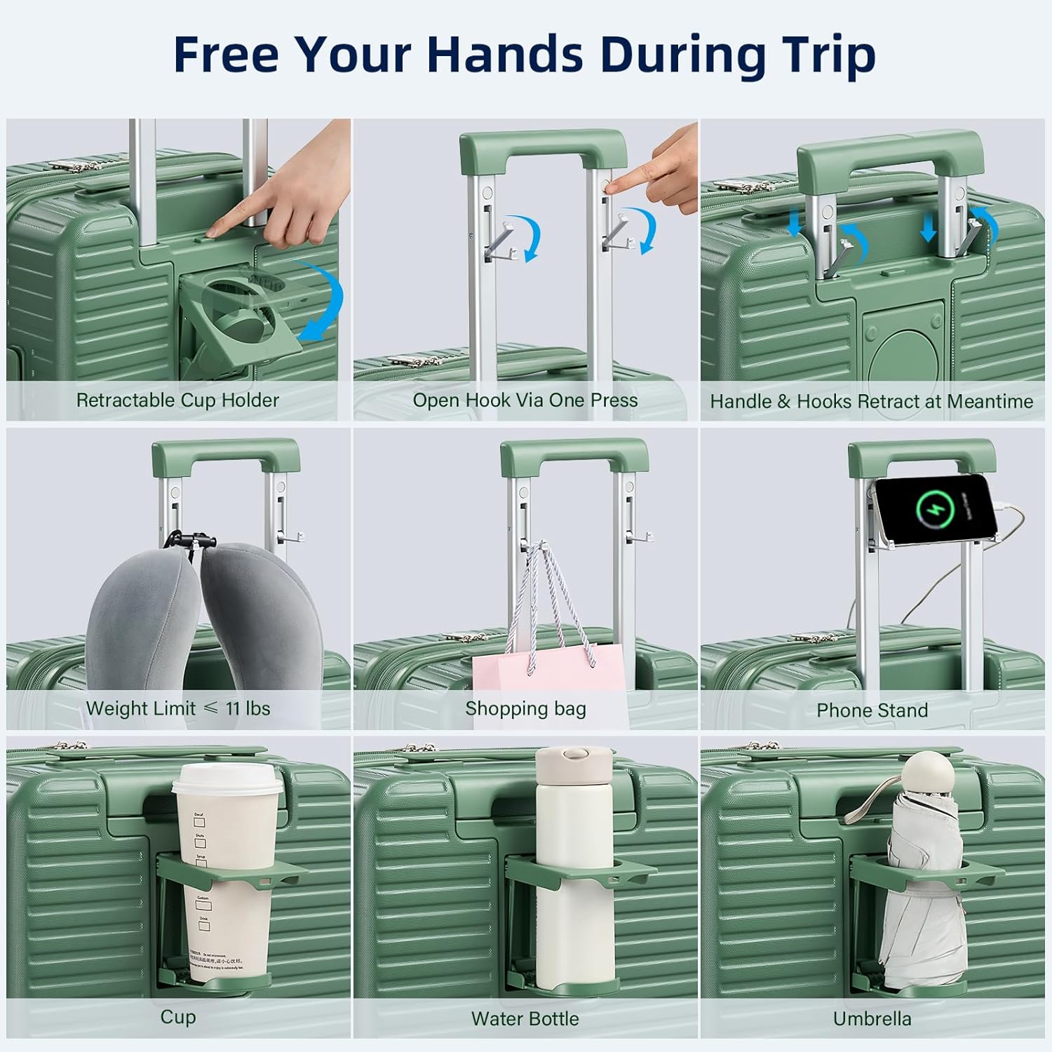 - 【Cup / Phone Holders & 2 Charging Ports】24 inch suitcase with spinner wheels fearures a universal cup holder for most water bottles, coffee mugs and tumblers. Retractable dual hooks securely hold various persoanl items like phone, iPad, U-shape throw pillow, handbag, etc (up to 11 lbs). Built-in charging ports allow on-the-go power access for Type-C / USB devices (portable power bank not included). Multifuncational green luggage to set your hands free during layover at airport / train station.