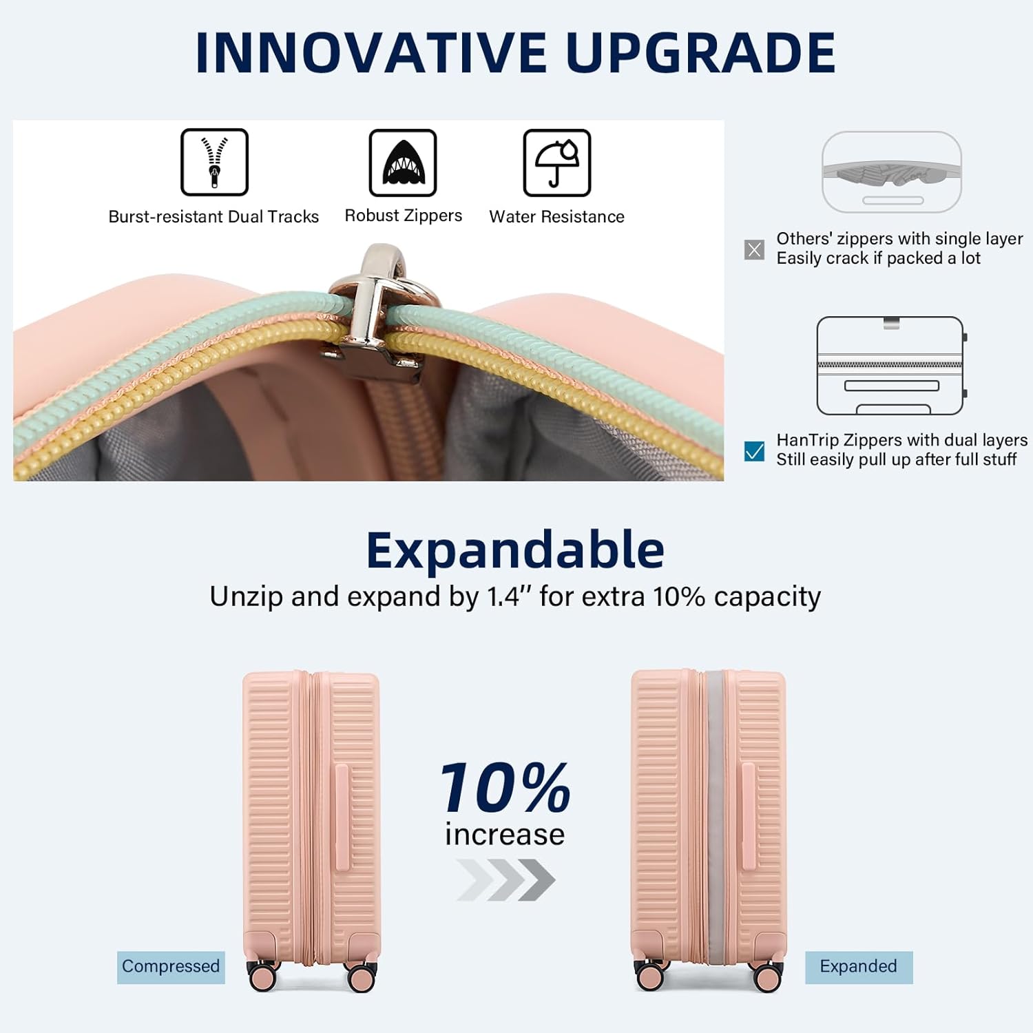 - 【Expandable Luggage Maximized Space】HanTrip suitcases with wheels checked luggage, suitcases of 3 sizes boast a built-in power bank pocket, a wet / dry seperate zone and 2 big compartments, large capacity for over 10 days’ personal items and travel essentials. For extra room, just unzippper and expand the suitcase by 10% space. Excellent durable luggage set for travelers of large capacity demand.