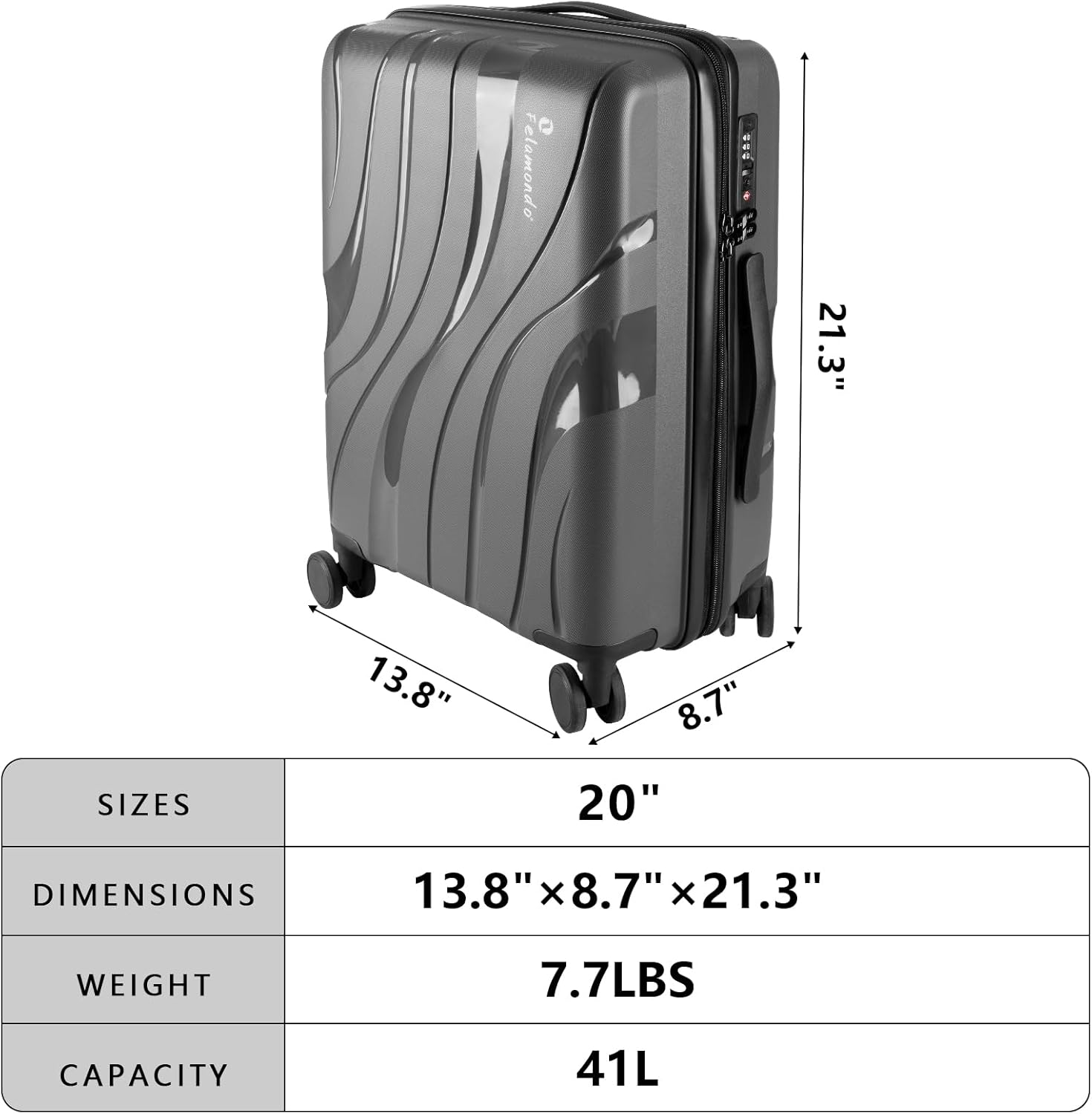 - Carry-On Luggage: This 13.8" x 8.7" x 21.3" hard shell suitcase meets size requirements for overhead bins on most major airlines. Its compact design ensures effortless cabin storage, making it ideal for business trips or short getaways.