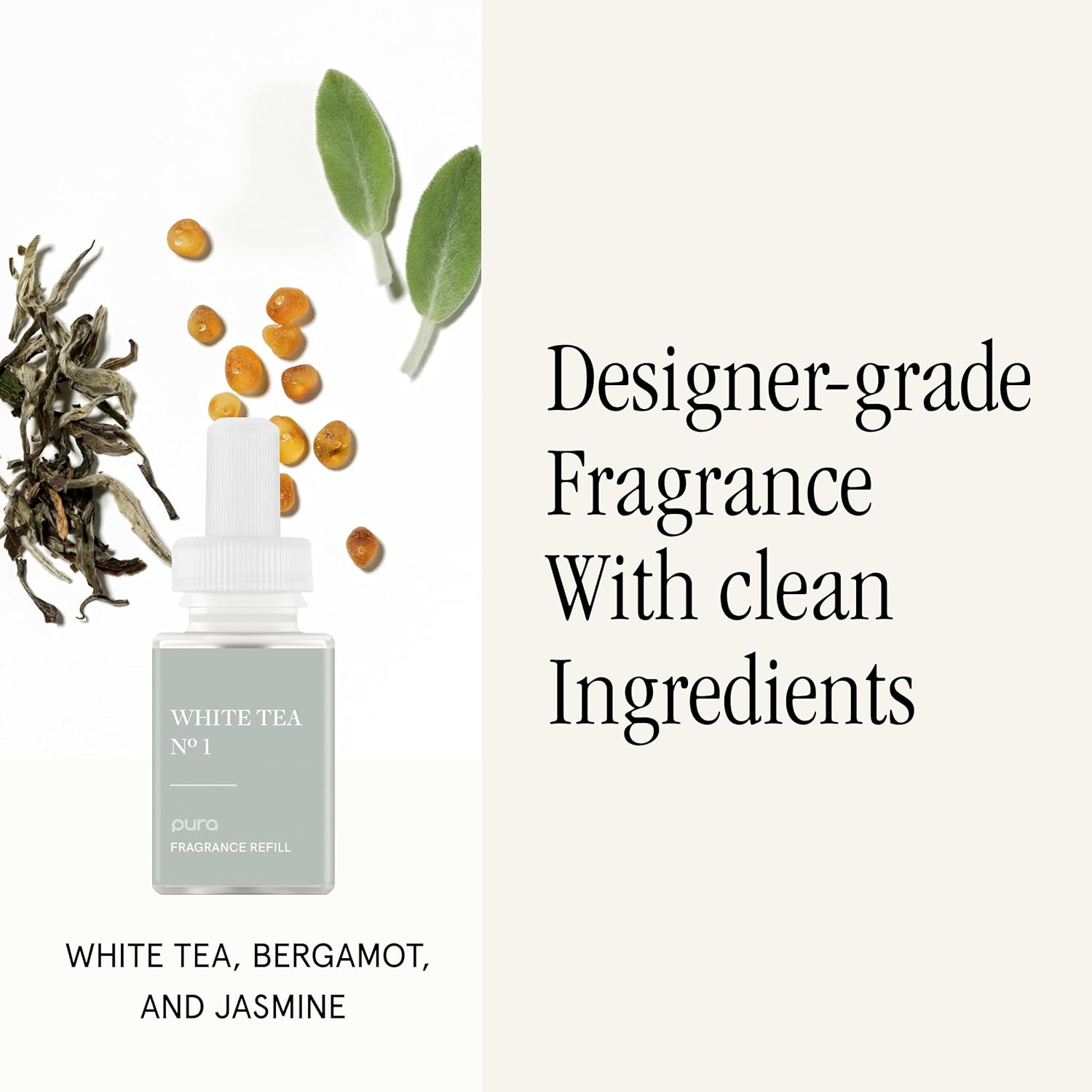 - Pura Home Fragrance Scent - White Tea No. 1 - Step into a dewy morning with a strong, refreshing scent that brightens every moment. Clean, fresh notes of white tea, citrus, and ozone accord blend with a gentle hint of jasmine tea, calming the senses and giving energy to your mood. Creamy cashmere and amber finish this fragrance, creating a beautiful balance for every space, that smells with a fresh jasmine smell