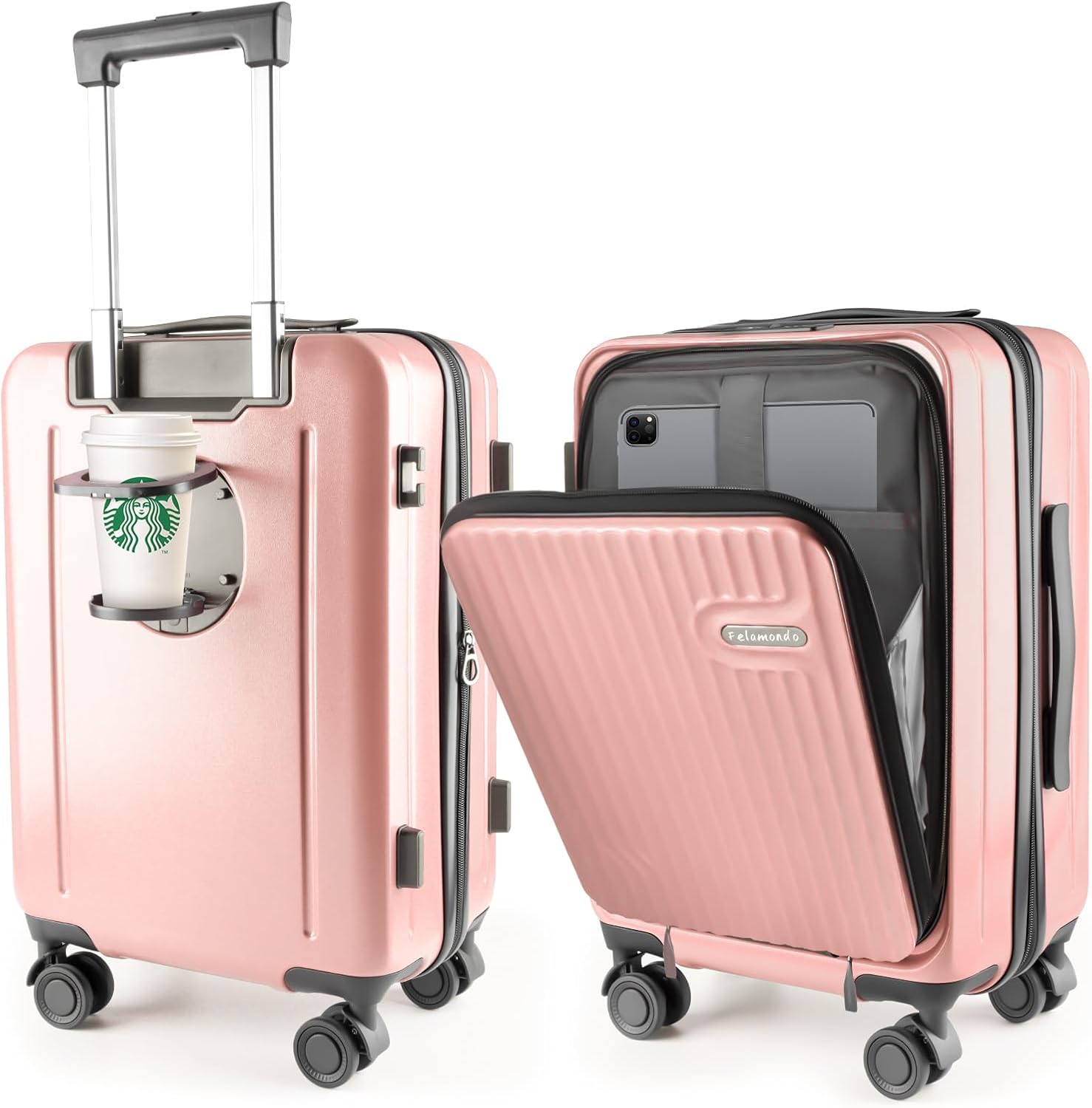 19-Inch Hardshell Carry-On Luggage with Front Compartment, 360-Degree Spinner Wheels, TSA Lock, Cup Holder & Bag Hook - Airline Approved Business Travel Suitcase (pink)