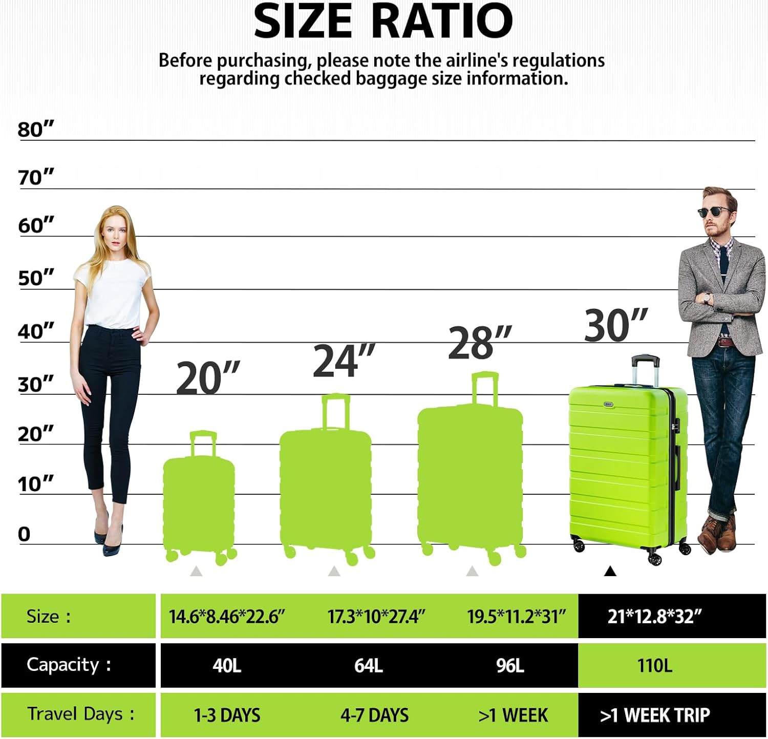 - [Checked-Large 30 Inch] The 30-inch suitcase meets the functions of boarding, travel, and daily storage. Size: 21*12.8*32 inches. Capacity: 110L.
