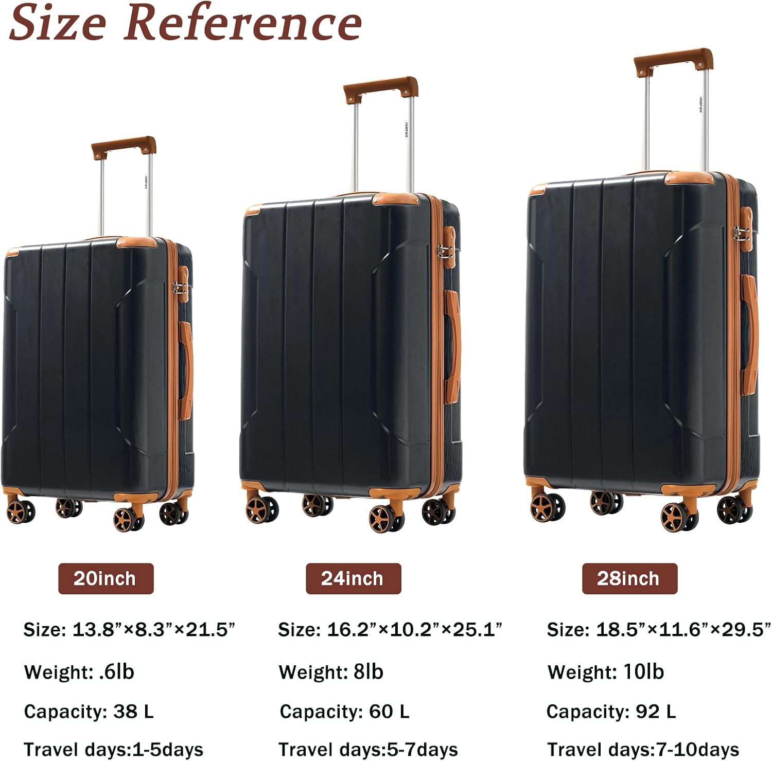 Merax Luggage Sets 3 Piece Hardshell 8 Spinner Wheels Lightweight Suitcase Corner Guards Travel Luggage (Black brown 20IN 24IN 28IN)