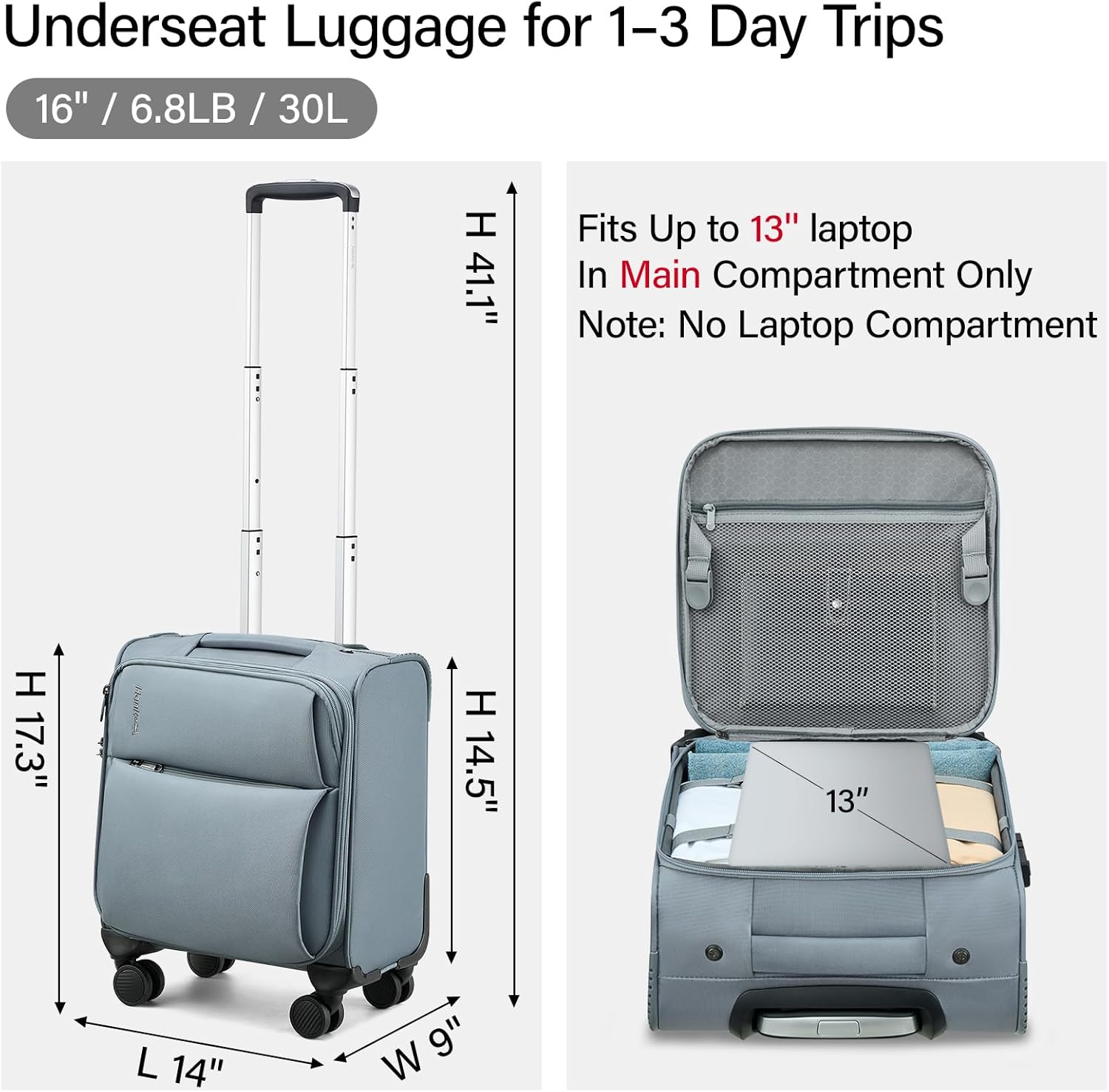 Hanke 16 Inch Underseat Carry On Luggage with Spinner Wheels for Airline, Small Softside TSA Approved Luggage Lightweight Rolling Suitcases Under Seat Travel Carry-On Bag(Grey)