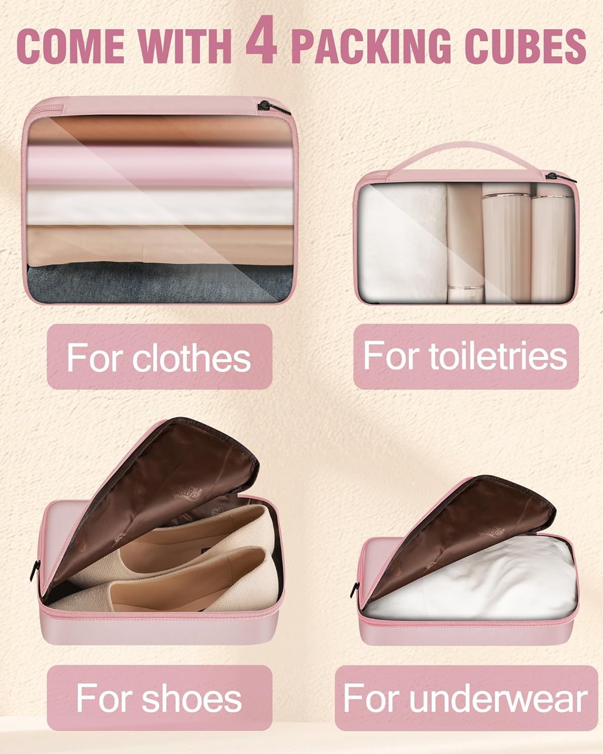 - EXTRA LARGE STORAGE: This carry on luggage comes with 4 packing cubes - 2 clear for clothes and toiletries, 2 opaque for underwear and shoes. Main compartment has a water-resistant area for unwashed clothes or other items. No need to rummage through all looking for one item, making life easier