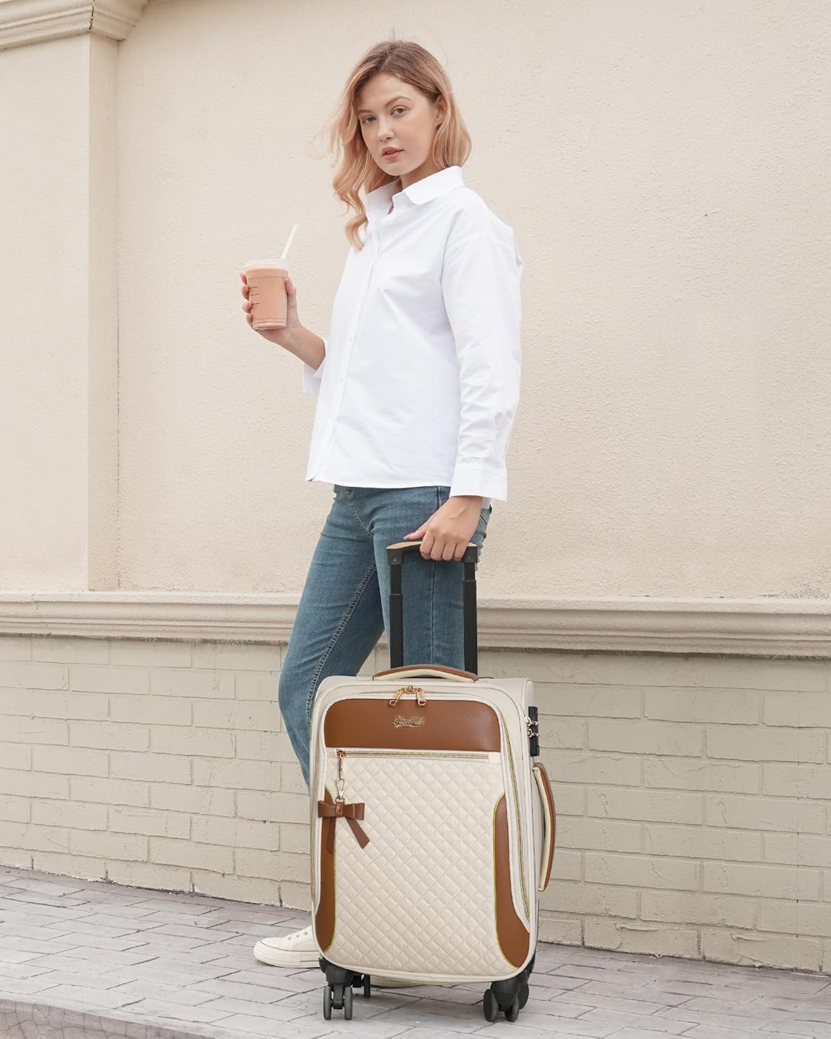 Carry On Luggage 22x14x9 Airline Approved, 20 Inch Softside Suitcase with 4 Pcs, Lightweight Luggage for Women with TSA Lock and 4 Spinner Wheels, Soft Side Carry-on Suitcases for Travel, Beige