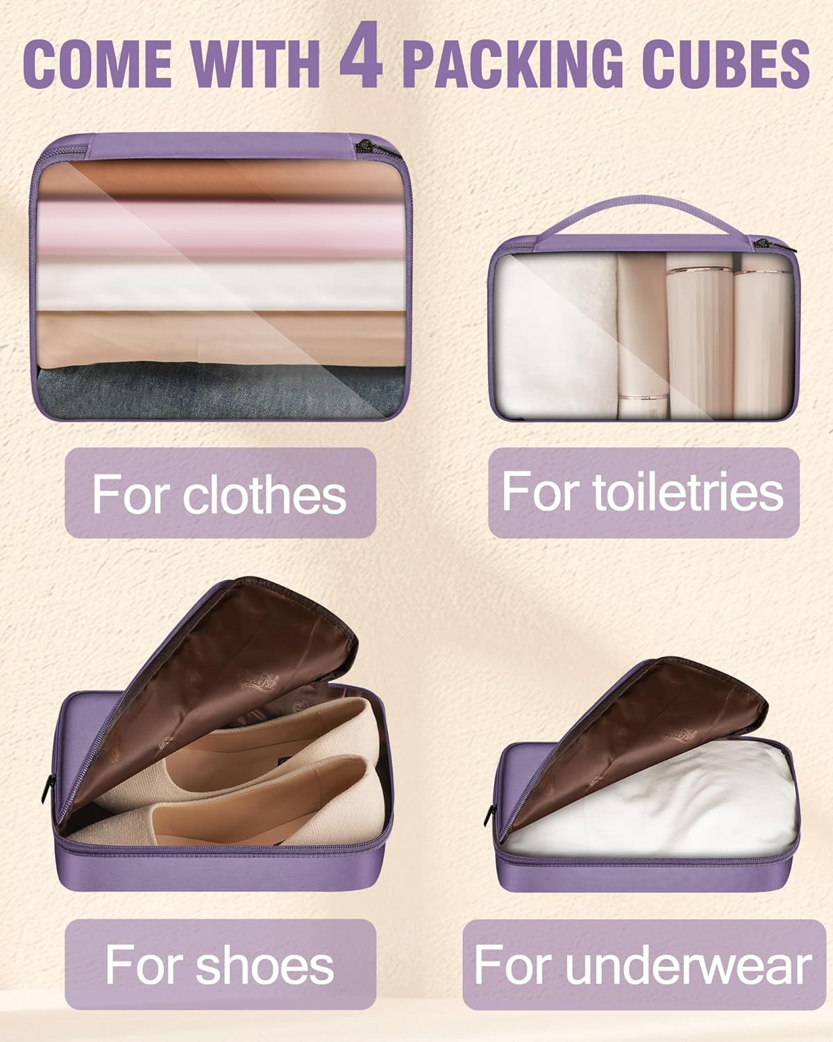 - EXTRA LARGE STORAGE: This carry on luggage comes with 4 packing cubes - 2 clear for clothes and toiletries, 2 opaque for underwear and shoes. Main compartment has a water-resistant area for unwashed clothes or other items. No need to rummage through all looking for one item, making life easier