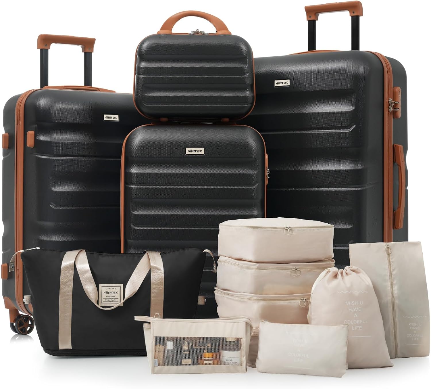 Merax Luggage Set 13 Piece, Hardshell ABS Suitcases with 8 Silent Spinner Wheels, Durable and Lightweight Travel Luggage for Family Trips, Black Brown