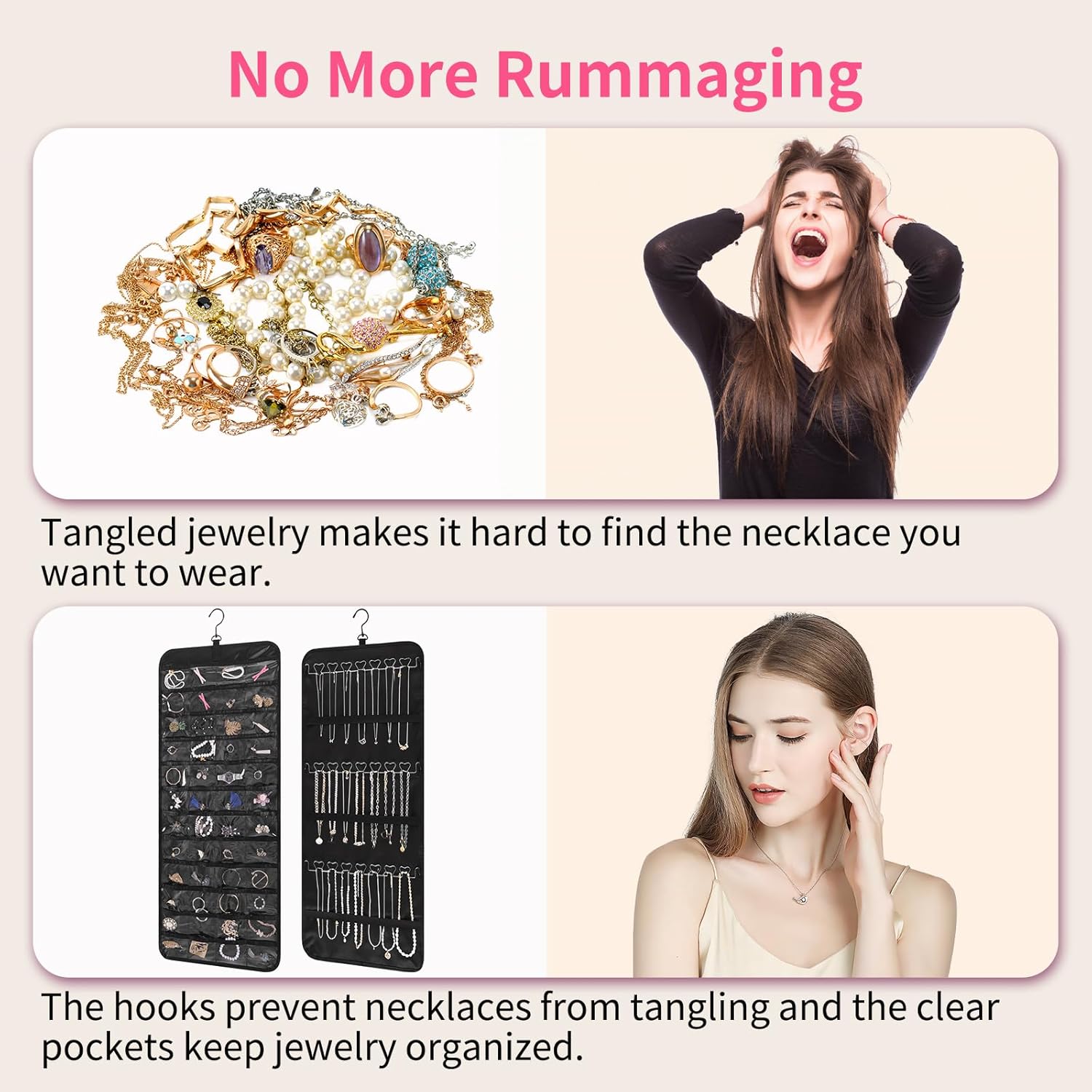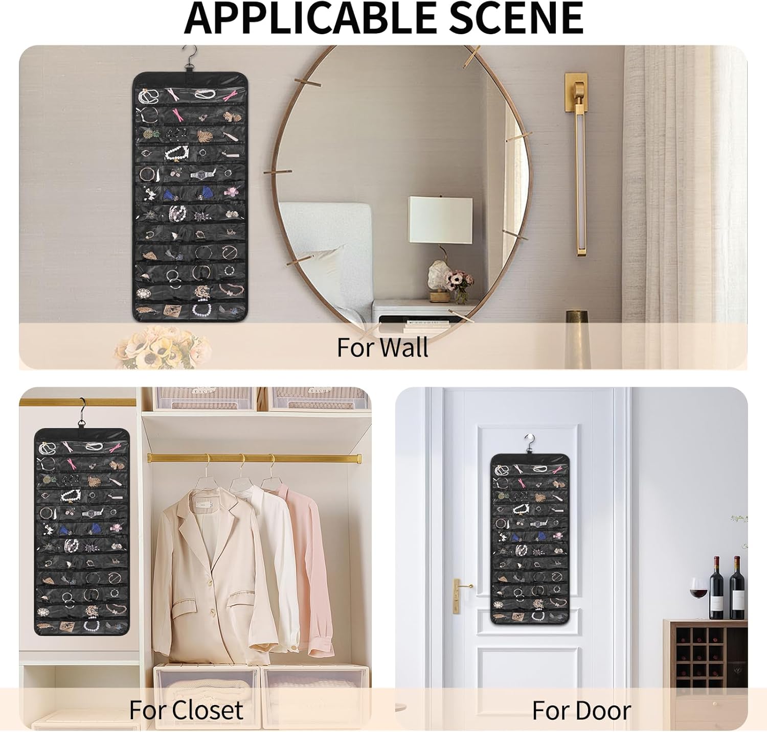 - [Dual-sided jewelry carrier]:This double-sided hanging jewelry organizer With 48 transparent pockets on one side,and other side features 3 rows of necklace hooks that can hold up to 21 necklaces, providing plenty of room for your entire collection.