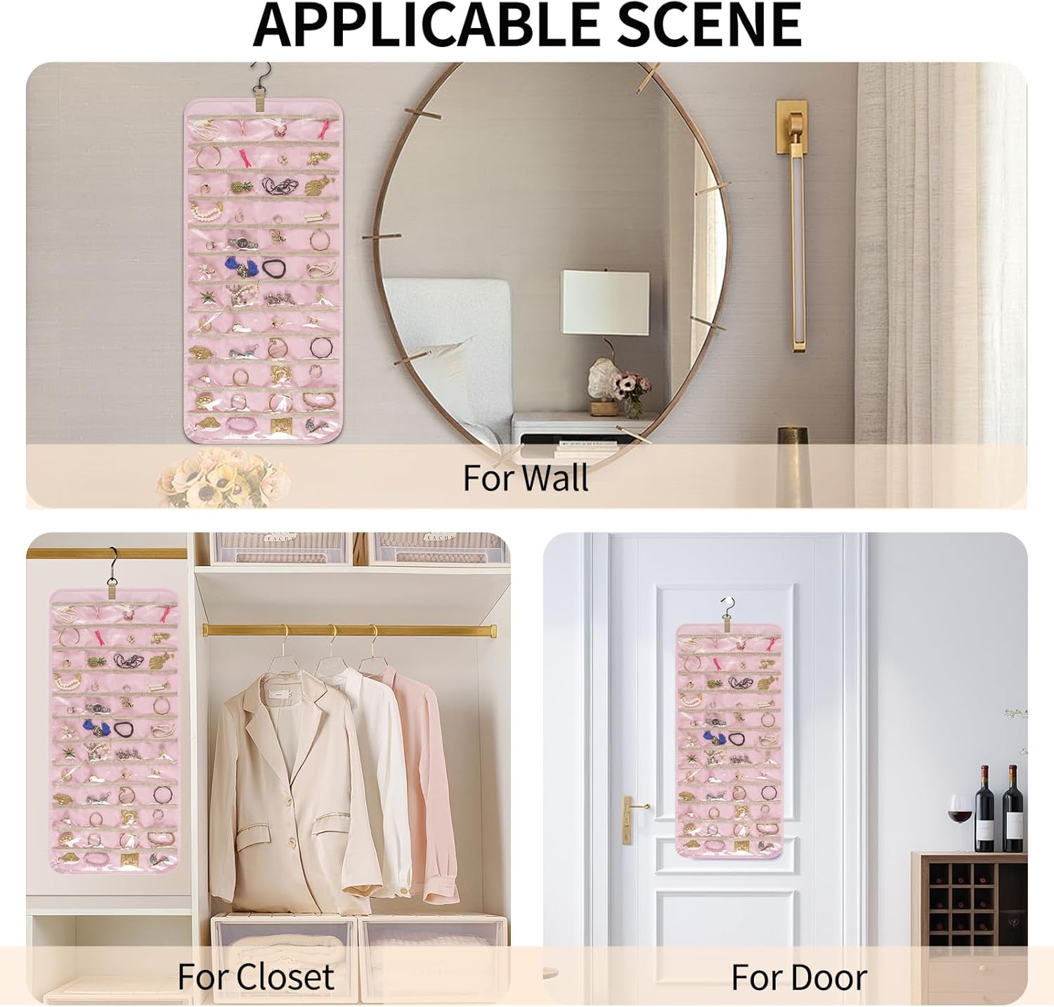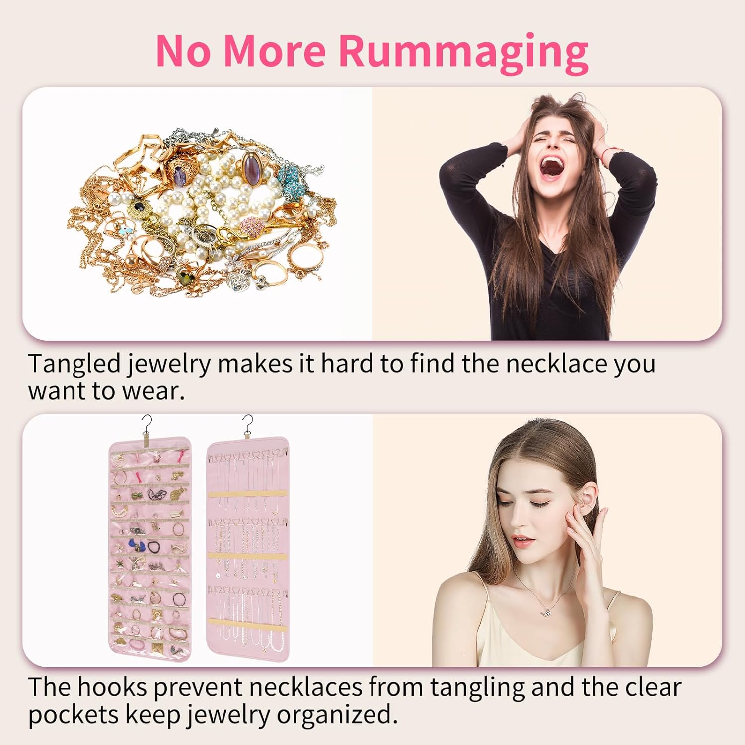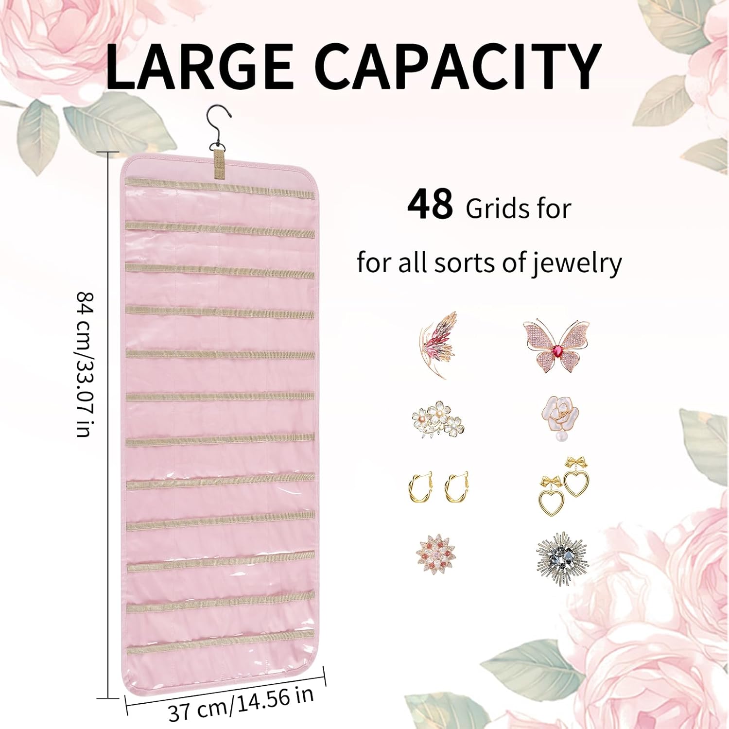 - [Dual-sided jewelry carrier]:This double-sided hanging jewelry organizer With 48 transparent pockets on one side,and other side features 3 rows of necklace hooks that can hold up to 21 necklaces, providing plenty of room for your entire collection.