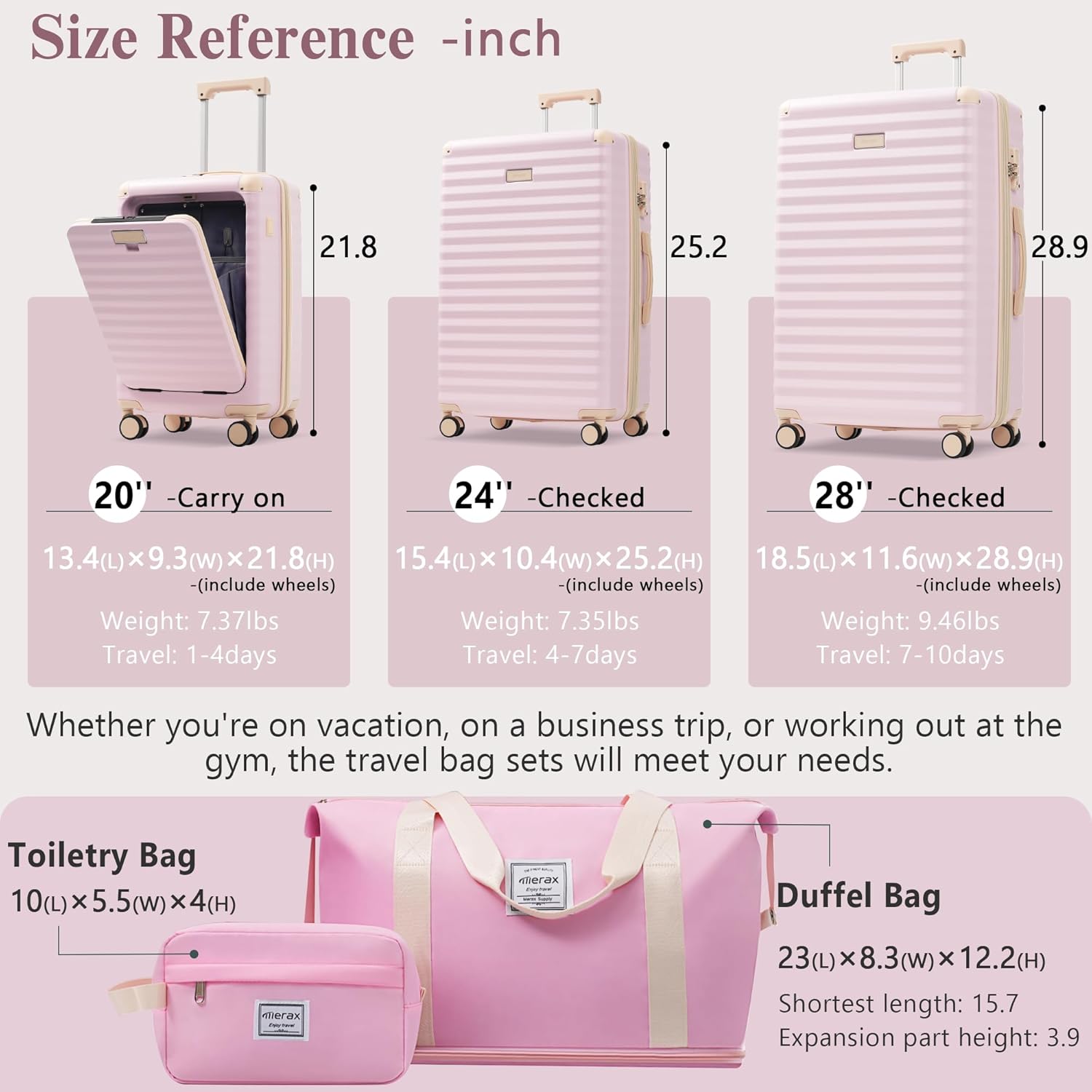 - 3 Piece Luggage Sets:The luggage set of 3 pieces offers 20" carry on luggage, 24" medium checked luggage,28" large check-in suitcase and 1 duffel bag + 1 toiletry bag, can be nested together for easy storage.Note: Only 20 inches is front opening.