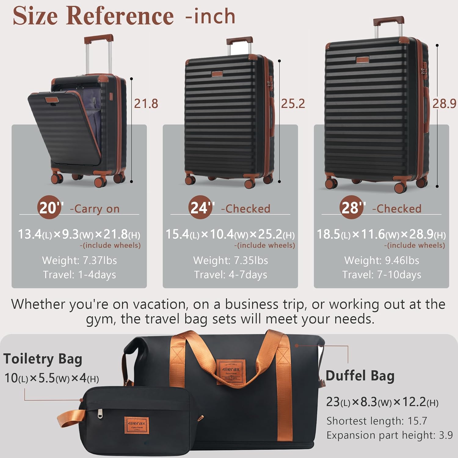 - 3 Piece Luggage Sets:The luggage set of 3 pieces offers 20" carry on luggage, 24" medium checked luggage,28" large check-in suitcase and 1 duffel bag + 1 toiletry bag, can be nested together for easy storage.Note: Only 20 inches is front opening.