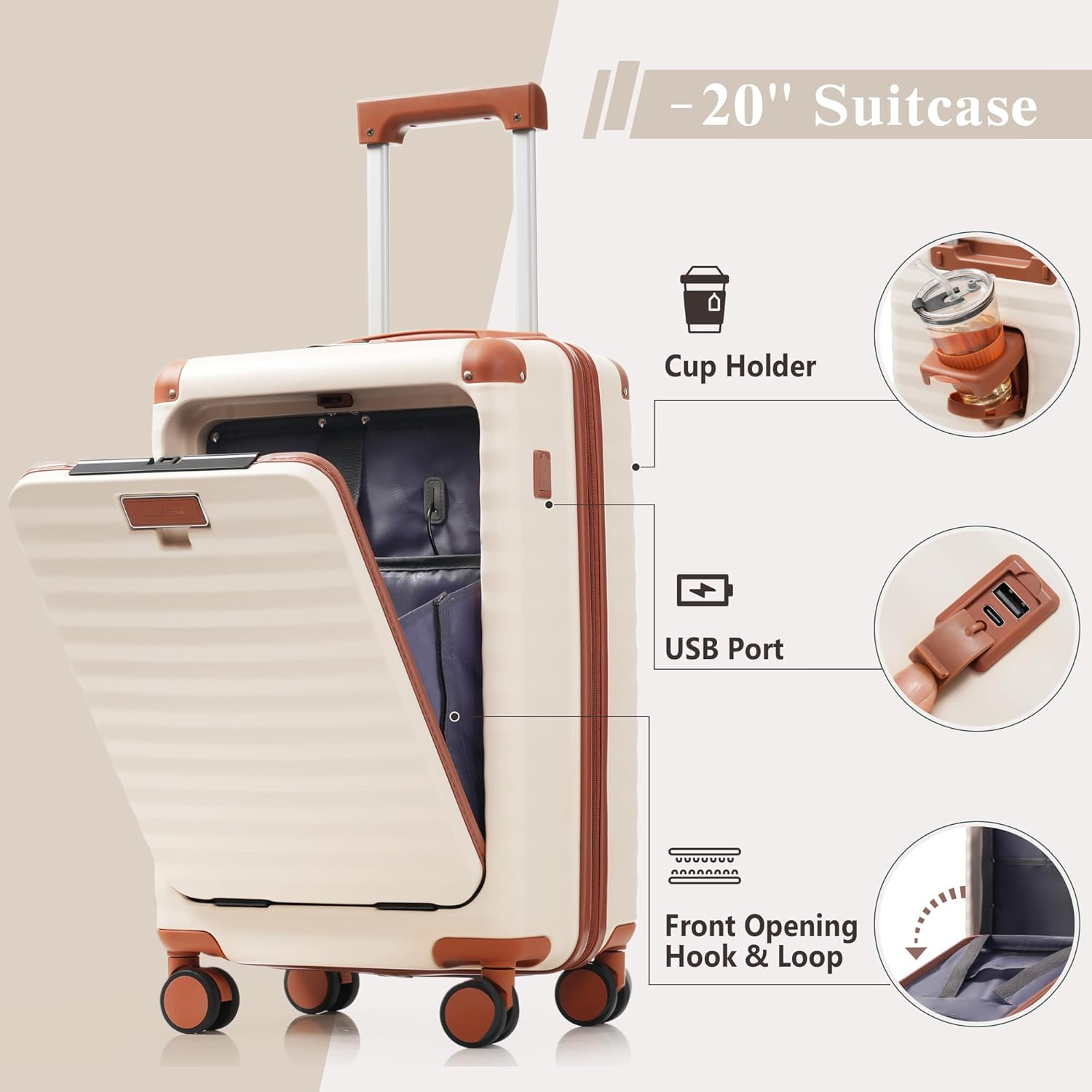 - Smart Features:The 20-inch carry-on is ideal for short trips, built-in USB port for charging devices on the go (power supply not included), keeping you connected during your travels.Cup holder on the suitcase back to hold a water bottle or a cup of coffee, freeing up your hands.
