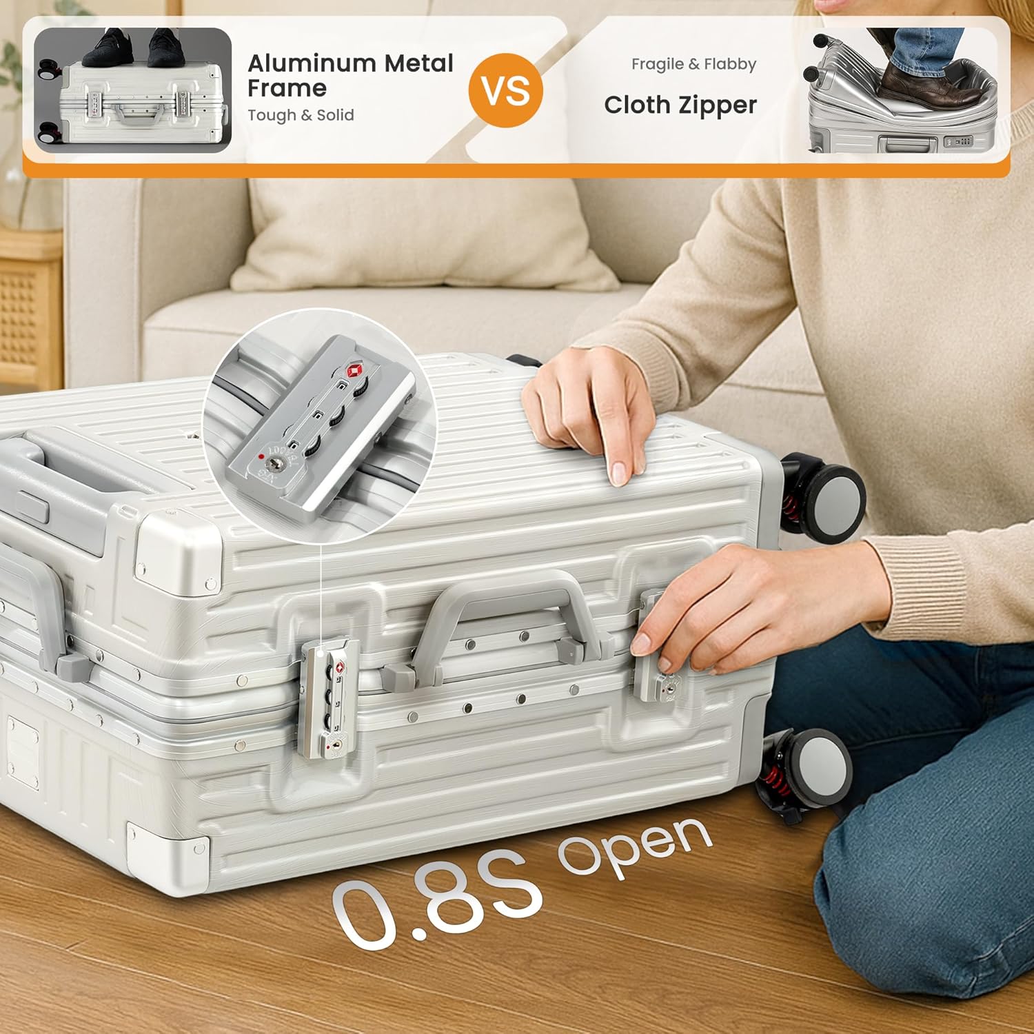 - PREMIUM MATERIAL: Crafted with premium materials, this zipperless aluminum luggage features an unbreakable hard shell and sturdy aluminum frame, providing excellent durability and scratch resistance