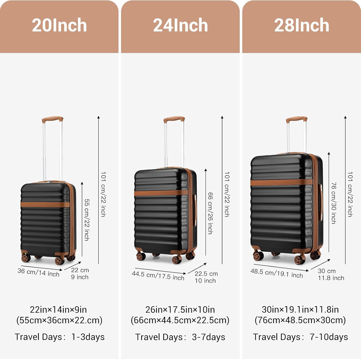 Kono Luggage Set 3 Pieces Expandable PC ABS Durable Suitcase Hardside with Double Spinner Wheels Tsa Lock Black Brown(20in/24in/28in)