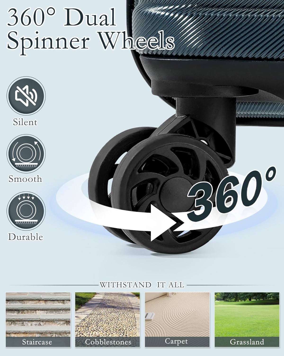 - Turns Easily: Effortless 360° movement with silent-roll wheels. No noise in airports or hotels. The sturdy 3-level pure aluminum telescoping handle adjusts smoothly to your height for comfortable pulling. Travel in quiet, smooth comfort.