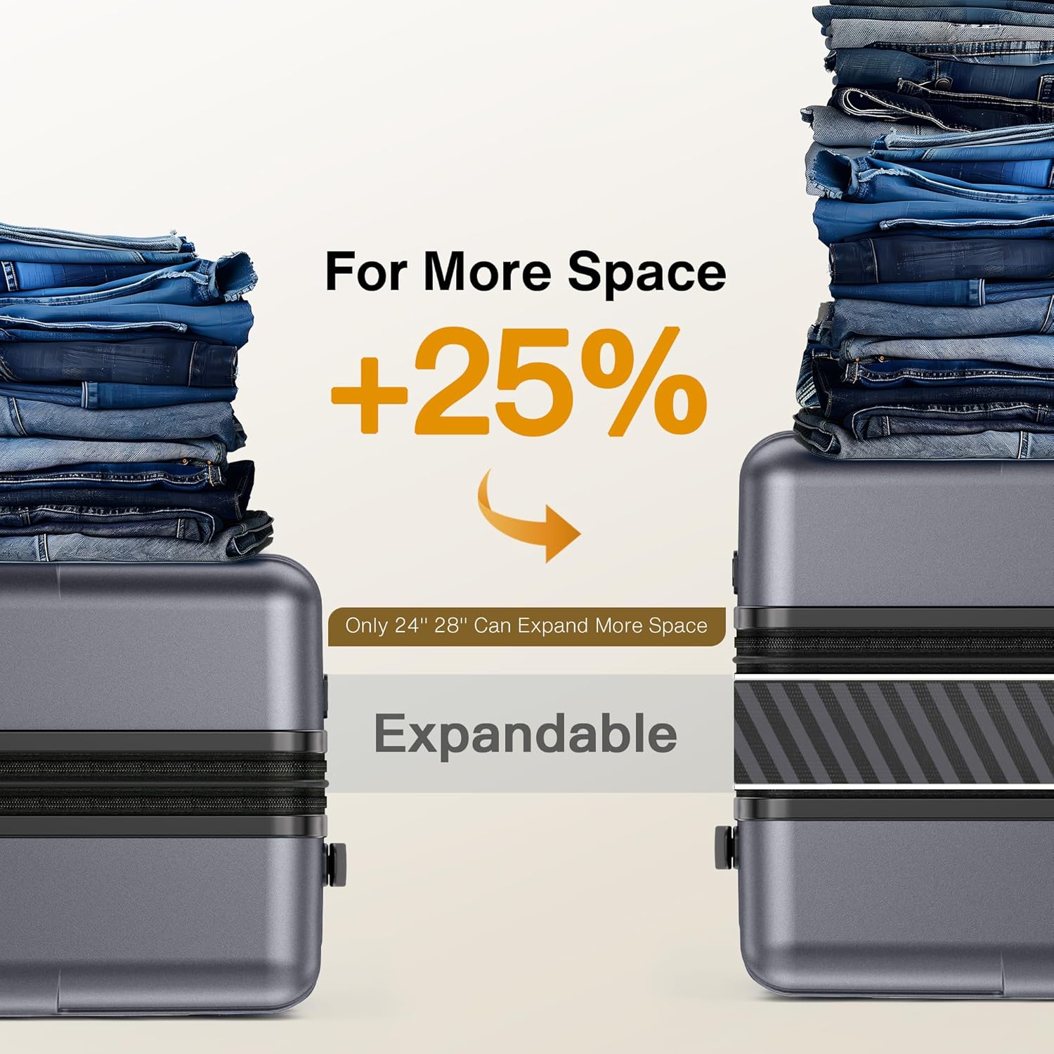 - Durable YKK Zipper & Expand 25%: Featuring YKK high-strength anti-burst zippers, rigorously tested for 100,000 cycles without failure—ensuring smooth operation and zero risk of zipper jams or splits, even under extended travel use. Use the expandable zipper, the suitcase easily releases an additional 25% of its capacity, maximizing your packing flexibility (Only 24in & 28in).