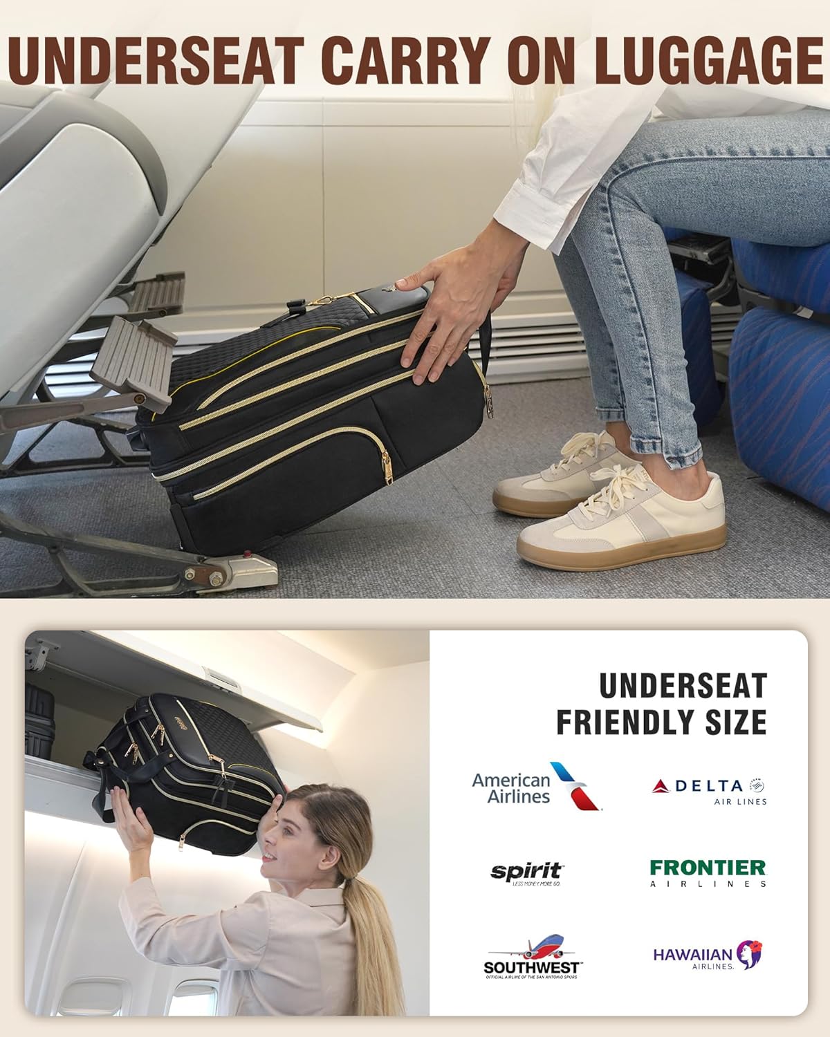 Underseat Carry On Luggage with Wheels, Airline Approved Personal Item Suitcase with Multiple Compartments, Lightweight Softside Under Seat Carry-on Suitcases for Women Travel Business, Black