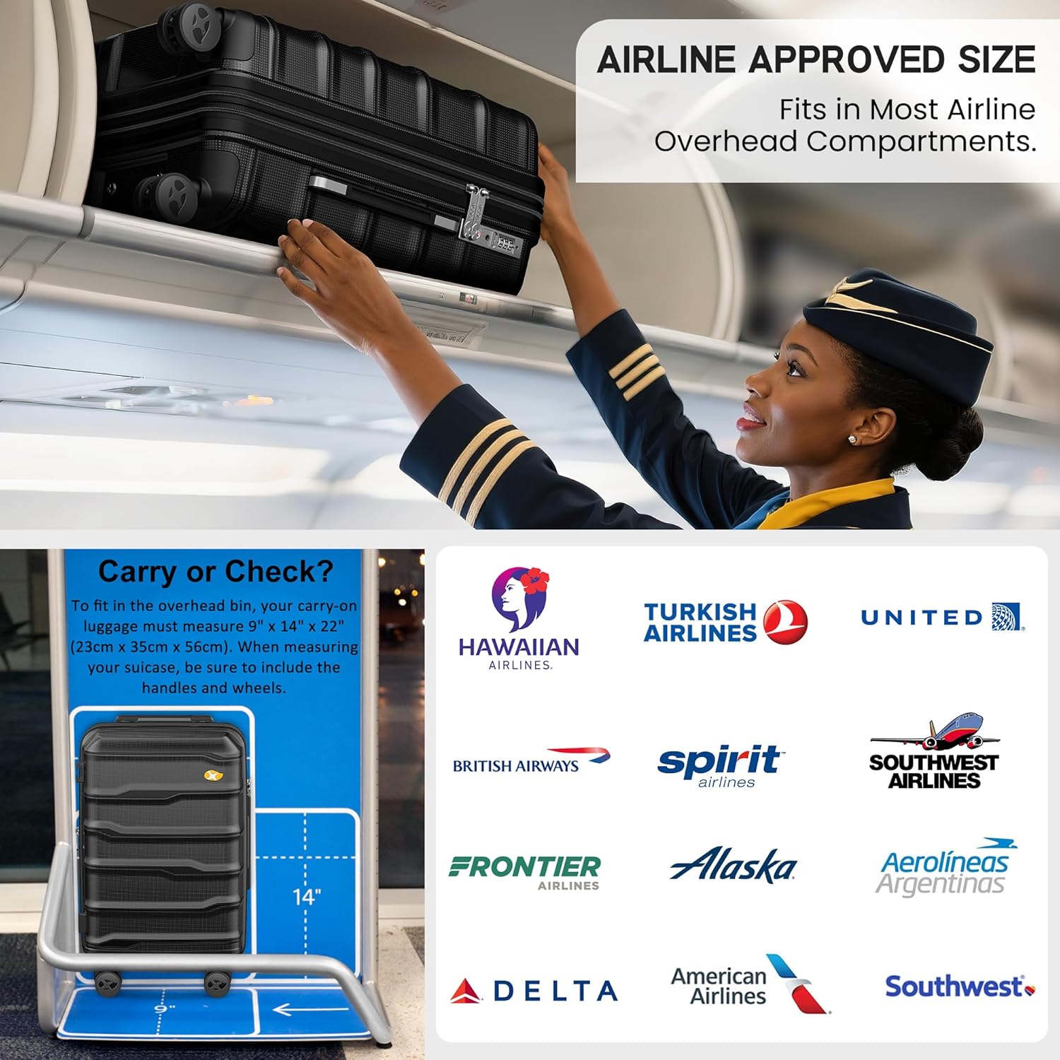 - 【360°SMOOTH-GLIDING SPINNER WHEELS】- Carry on luggage 22x14x9 airline approved's durable spinner wheels, which are composed of precision shaft center and thickened wheel skin, are very wear-resistant, quieter and have strong bearing capacity. Ideal for maneuvering through crowded spaces or rushing to catch flights.