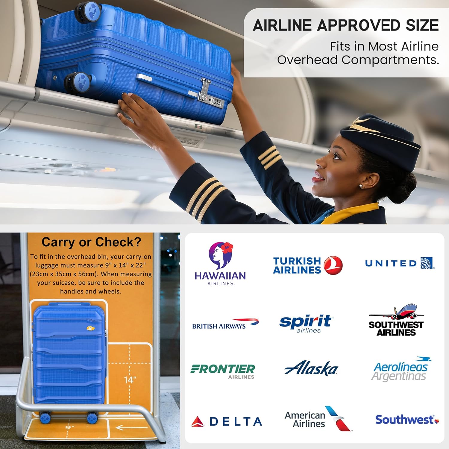 - 【360° Smooth-Gliding Spinner Wheels】- Carry on luggage 22x14x9 airline approved's durable spinner wheels, which are composed of precision shaft center and thickened wheel skin, are very wear-resistant, quieter and have strong bearing capacity. Ideal for maneuvering through crowded spaces or rushing to catch flights.