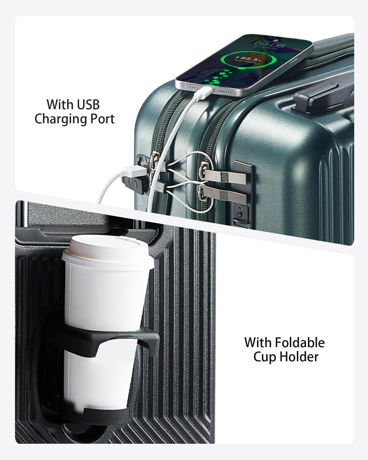 UrbanExplorer 20 Inch Carry-On Luggage with Front Opening, Cup Holder & USB Port, Lightweight ABS+PC Hardshell Spinner Suitcase, Airline Approved, 360° Wheels, Sliver
