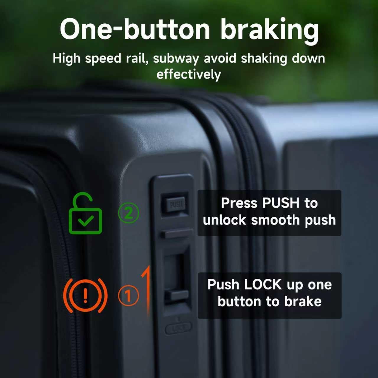 - 【Brake System Design】: A one-touch brake button ensures reliable braking functionality, preventing the luggage from rolling unintentionally and maintaining a fixed position. This significantly enhances usability and safety. The wheels are swivel, durable, low-noise, wear-resistant, shock-absorbing, and leave no marks on floors, demonstrating practicality and meticulous craftsmanship.