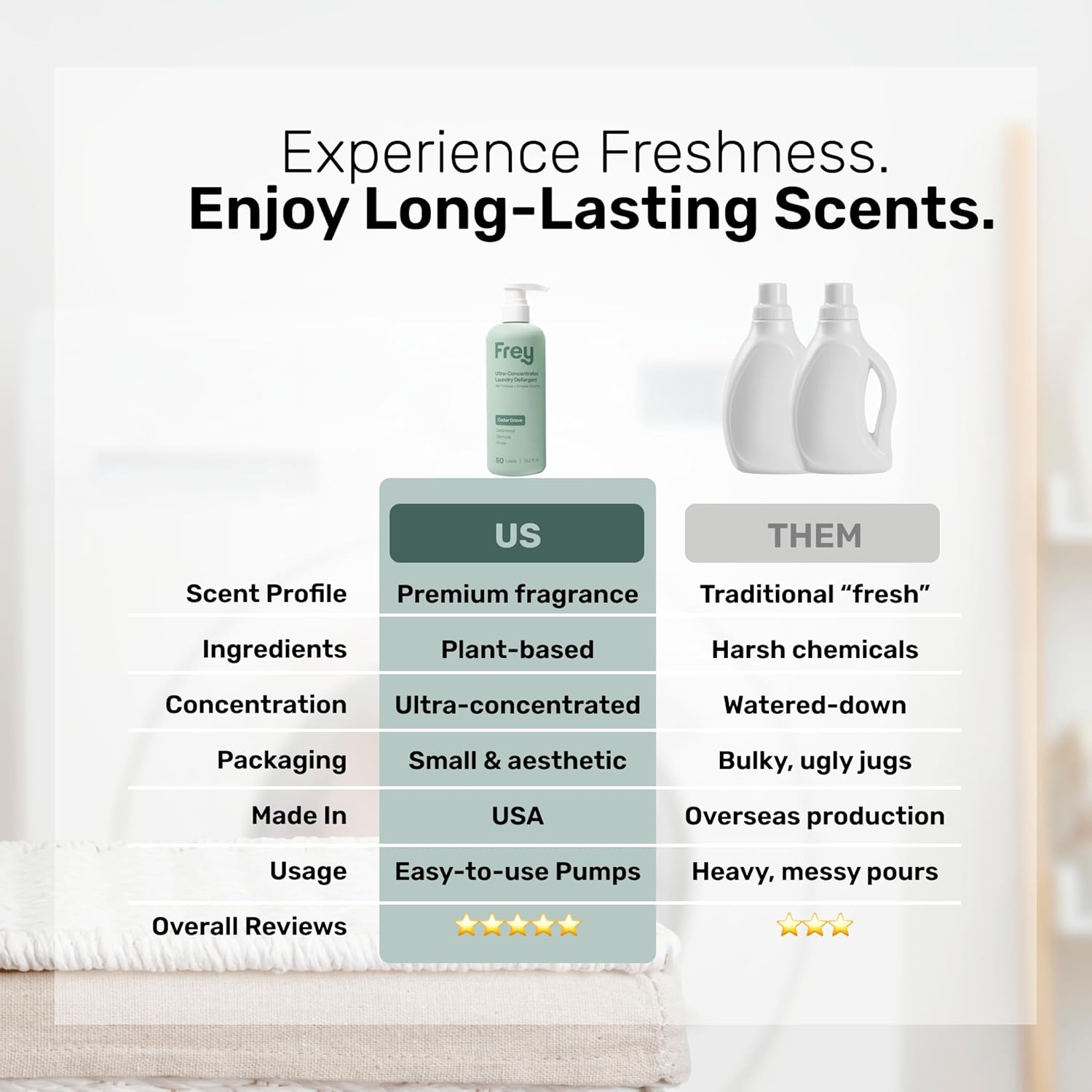 - LONG LASTING DETERGENT THAT'S SAFE FOR YOU - FREY's powerful concentrated laundry detergent liquid is formulated to last a long time and is also made without harsh ingredients, making it safe for you and your clothes. The perfect pairing to our fabric softener, the FREY detergent includes ingredients like Cedarwood, Oakmoss and Amber and is HE compatible.