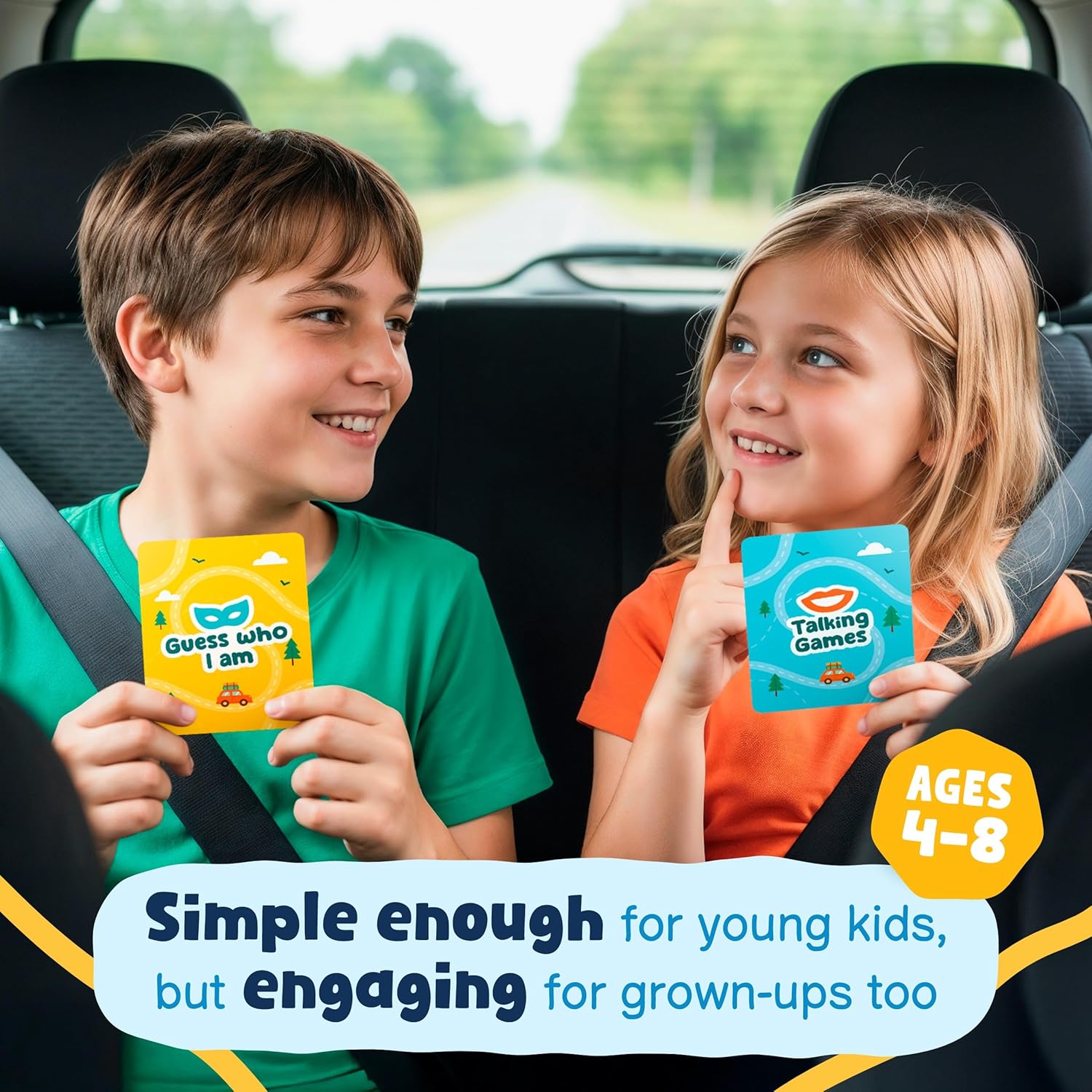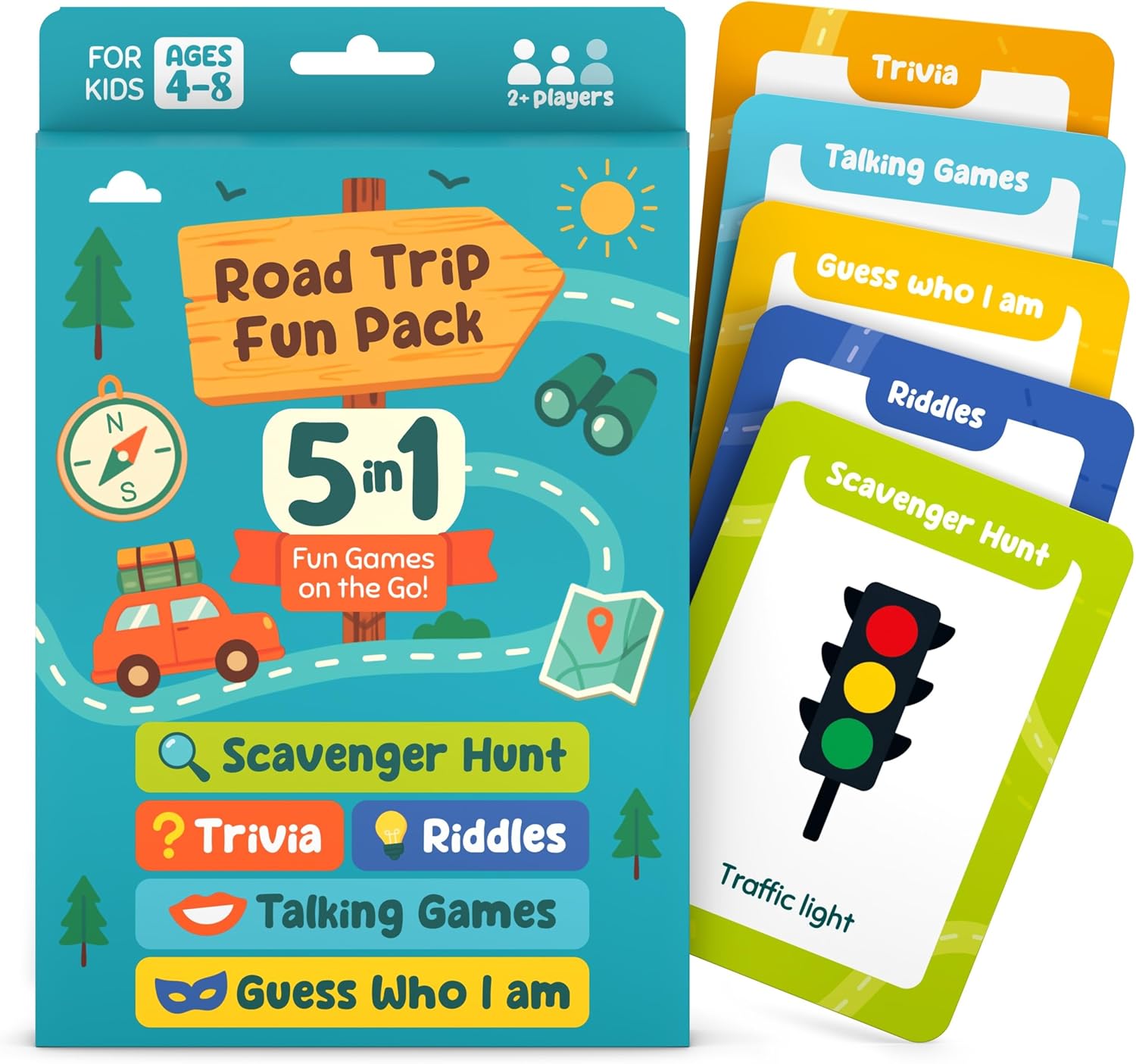- 5-in-1 Road Trip Game Pack – Keep boredom away with five fun car games in one! Scavenger Hunt, Trivia, Riddles, Talking Games, and Guess Who I Am are perfect for ages 4–8 and beyond.
