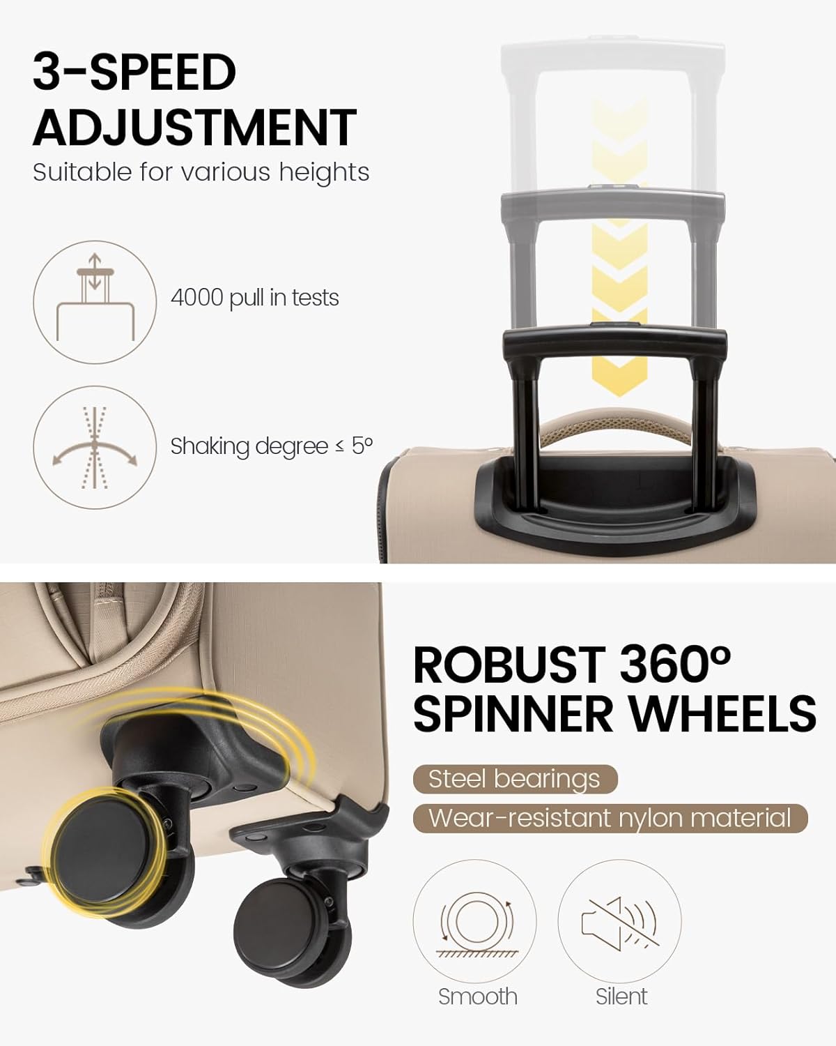 - 【Durable & Smooth-Silent Mobility】Made from premium water- and scratch-resistant polyester, this soft carry-on luggage withstands travel rigors. Its 360° silent spinner wheels feature a precision shaft and thickened design for wear resistance, quiet operation, and superior load capacity.