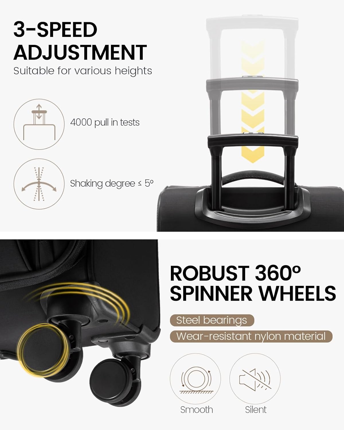 - 【Durable & Smooth-Silent Mobility】Made from premium water- and scratch-resistant polyester, this soft carry-on luggage withstands travel rigors. Its 360° silent spinner wheels feature a precision shaft and thickened design for wear resistance, quiet operation, and superior load capacity.
