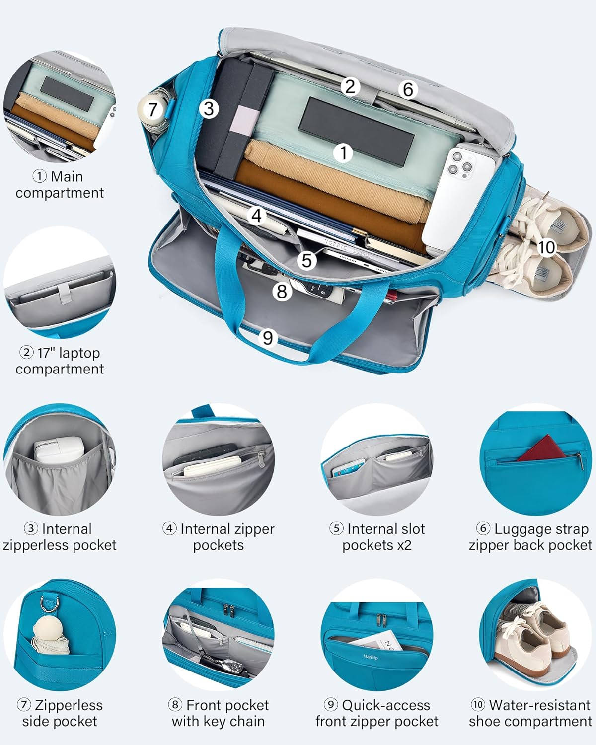 - 【Spacious Luggage Bag】Carry on duffel bag boasts 36.5L intelligently partitioned space for ultimate organization. Main compartment includes 17-inch laptop sleeve, 1 zippered pocket and 3 open pockets to place clothing or other travel essential. 2 exterior quick-access front pockets with a built-in keychain, hold key, magazine, passport, cosmetics, etc. 2 side pockets for water bottle, umbrella, shoe or toiletries. While the anti-theft zippered back pocket secures valuable like cellphone.