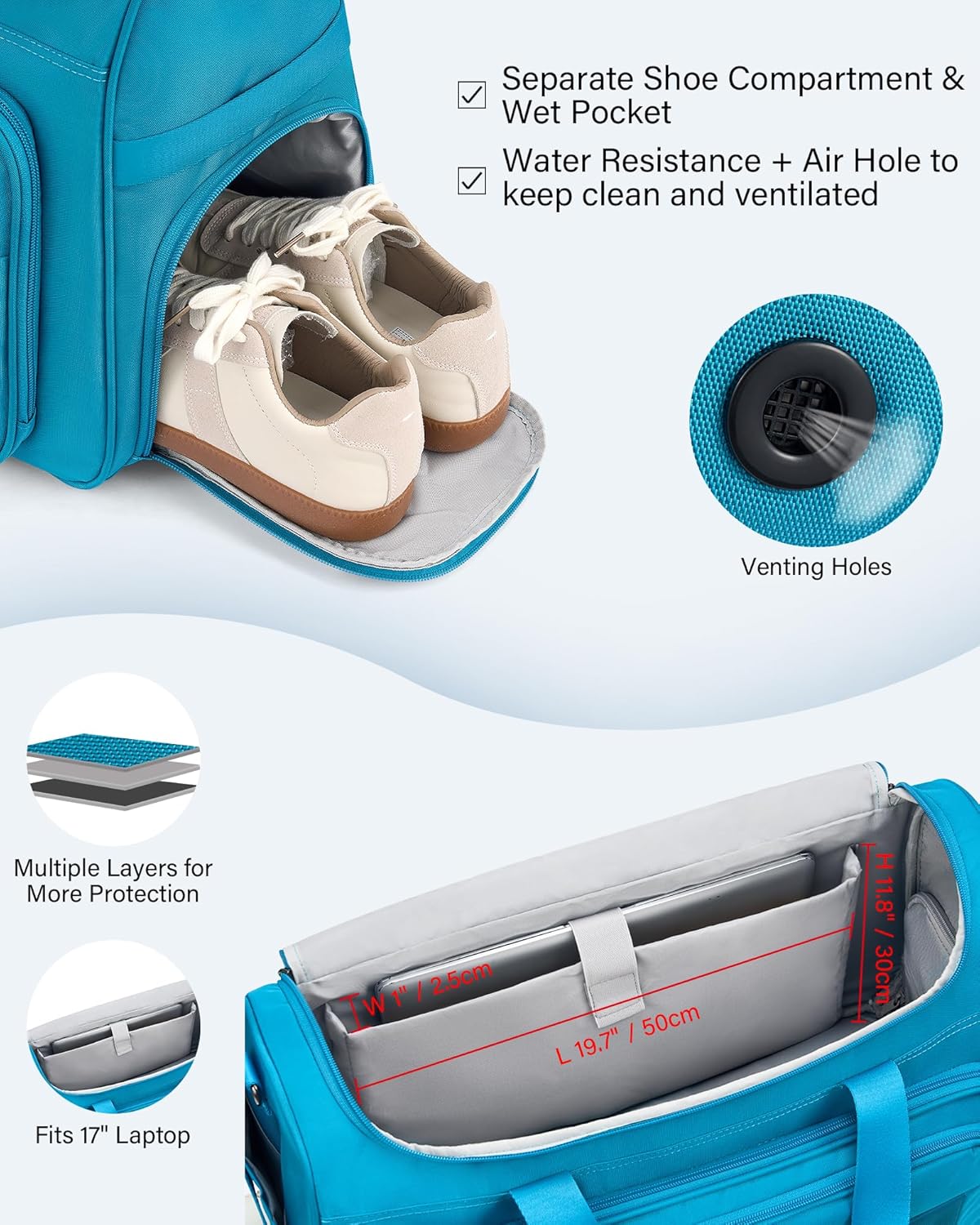 - 【Large Carry on Duffel Bag with Laptop & Shoe Compartment】Measuring 21.46×7.87×13.19 inches (54.5×20×33.5cm) and weighing just 3.09 pounds, this travel personal item bag fits effortlessly in overhead bins (DOESN'T FIT UNDER SEAT). The interior features a thickened padded laptop sleeve (19.7×1×11.8 inches) for 17-inch electronic devices, plus a dedicated ventilated shoe compartment of water-resistant lining with an air hole to keep fresh and tidy.
