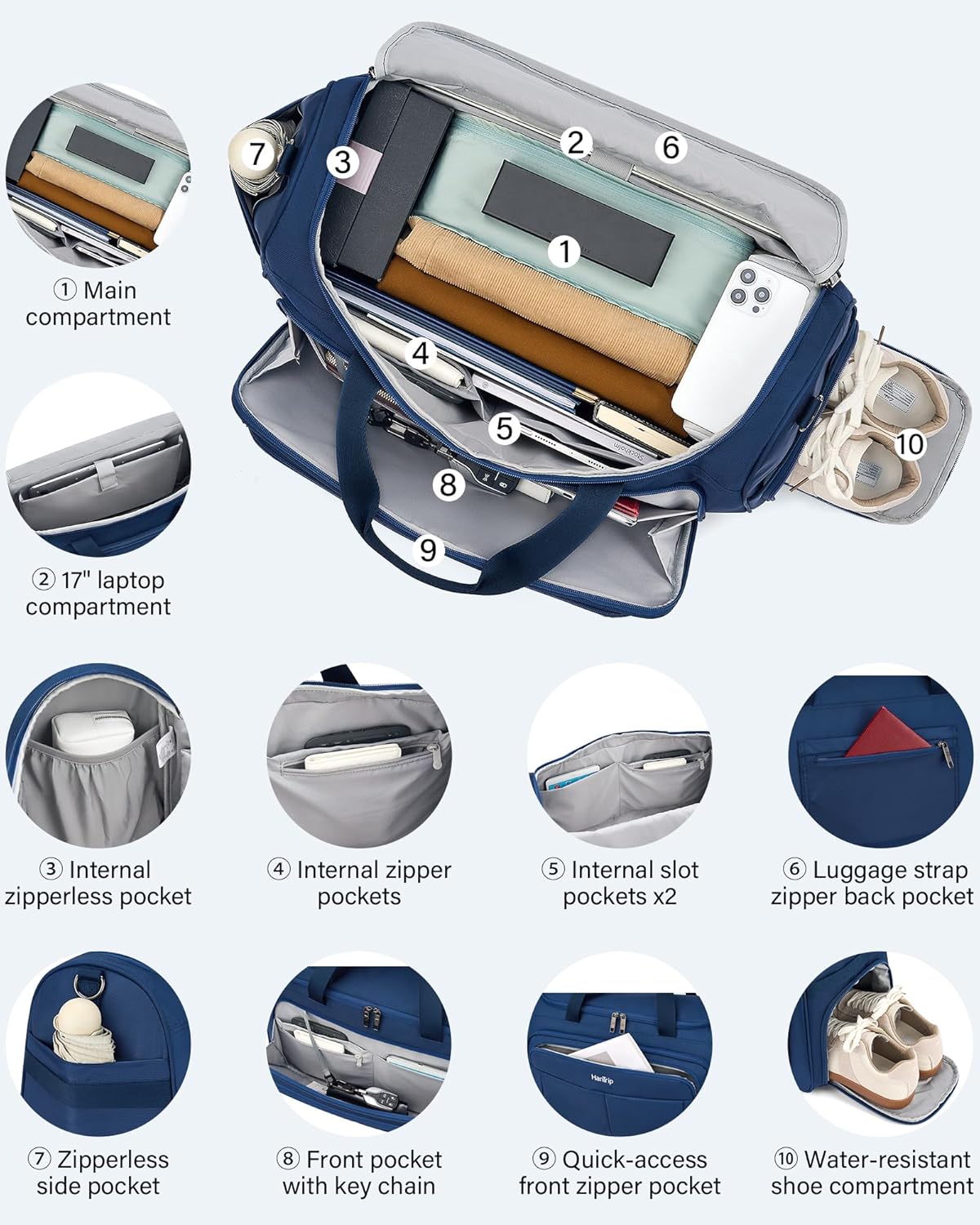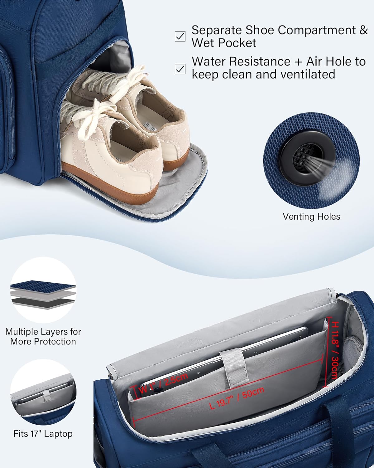- 【Large Carry on Duffel Bag with Laptop & Shoe Compartment】Measuring 21.46×7.87×13.19 inches (54.5×20×33.5cm) and weighing just 3.09 pounds, this travel personal item bag fits effortlessly in overhead bins (DOESN'T FIT UNDER SEAT). The interior features a thickened padded laptop sleeve (19.7×1×11.8 inches) for 17-inch electronic devices, plus a dedicated ventilated shoe compartment of water-resistant lining with an air hole to keep fresh and tidy.