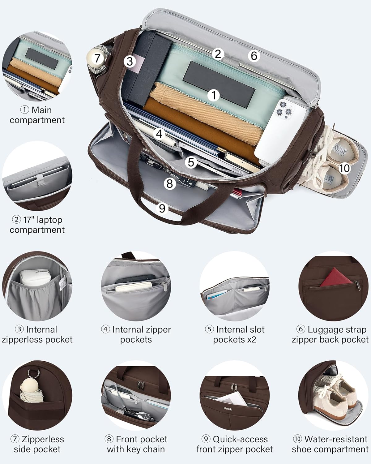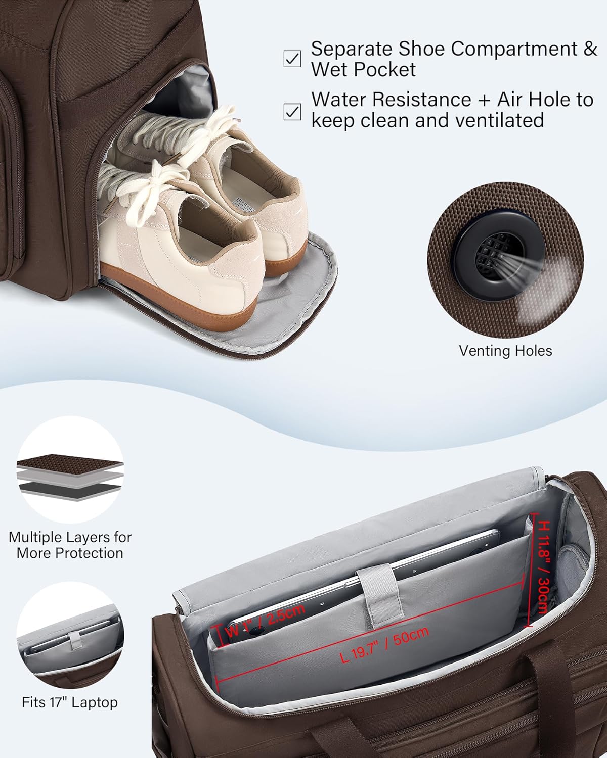 - 【Large Carry on Duffel Bag with Laptop & Shoe Compartment】Measuring 21.46×7.87×13.19 inches (54.5×20×33.5cm) and weighing just 3.09 pounds, this travel personal item bag fits effortlessly in overhead bins (DOESN'T FIT UNDER SEAT). The interior features a thickened padded laptop sleeve (19.7×1×11.8 inches) for 17-inch electronic devices, plus a dedicated ventilated shoe compartment of water-resistant lining with an air hole to keep fresh and tidy.