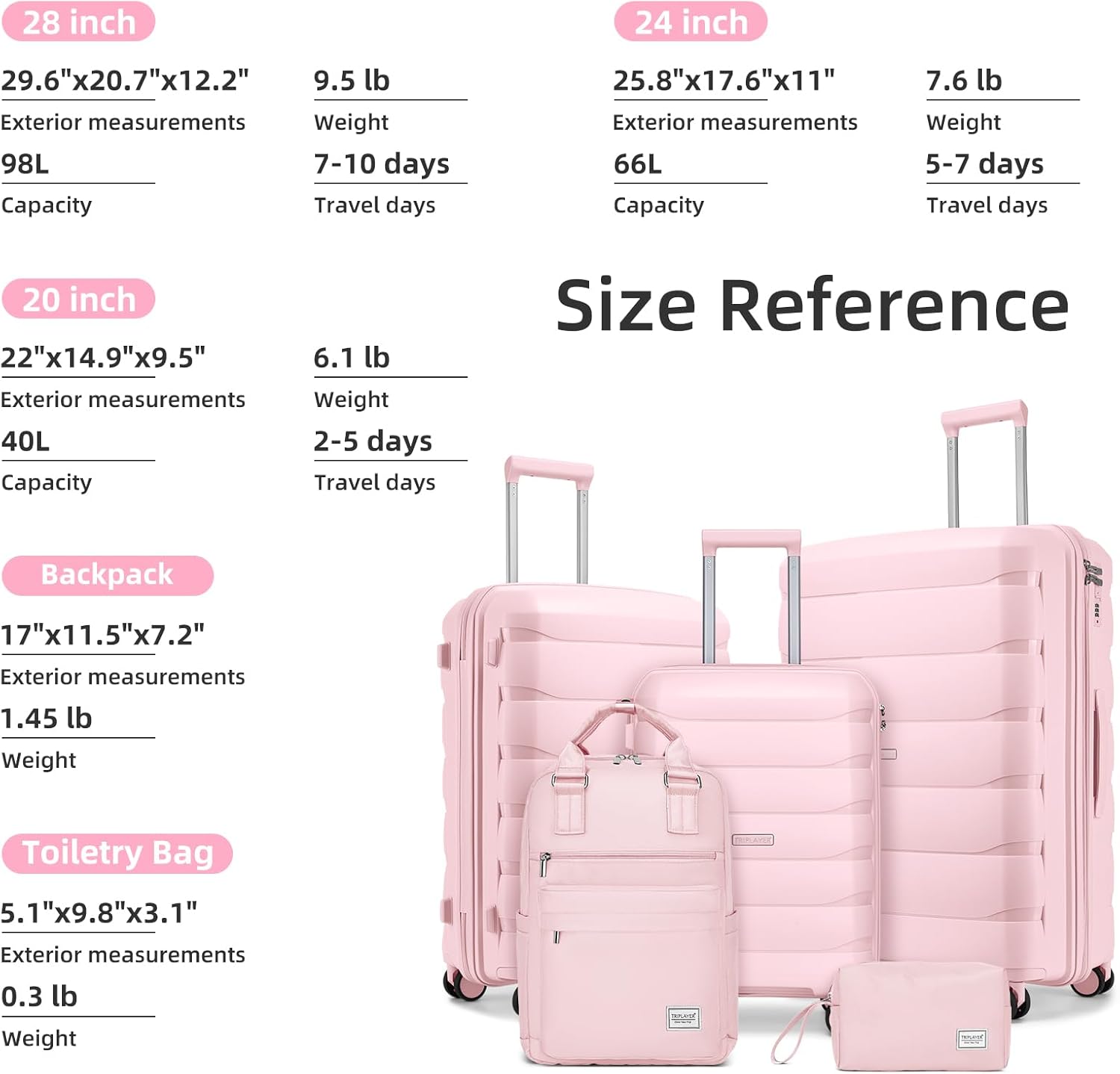 - 【5-piece Luggage Sets】Includes a 20" carry-on luggage, a 24" checked suitcase, a 28" large suitcase, a backpack and toiletry bag