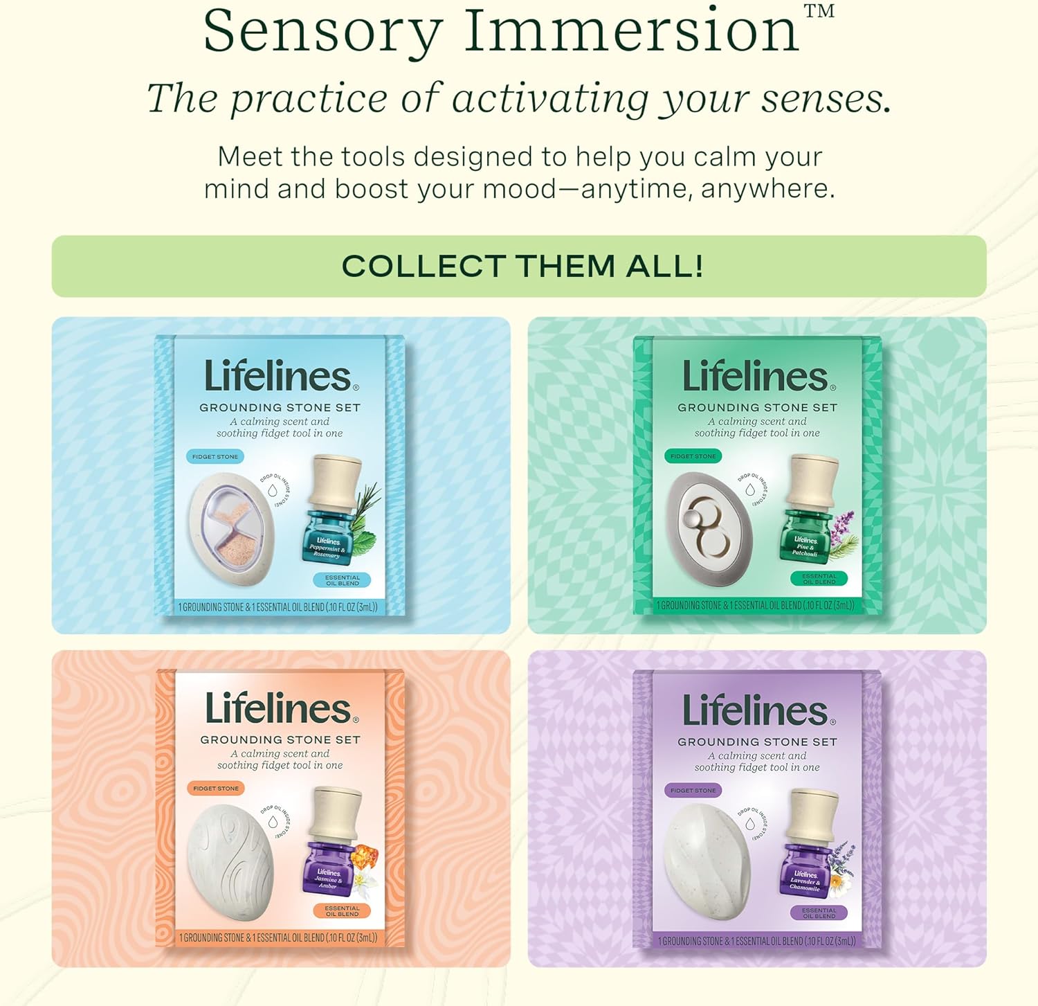 - Lifelines Grounding Stone Gift Set: Combine the calming sensory act of fidgeting with scent to help you feel more present and focused. Includes 1 Grounding Stone and 1 In Bloom Essential Oil Blend. Makes a thoughtful holiday gift and feel-good stocking stuffer!