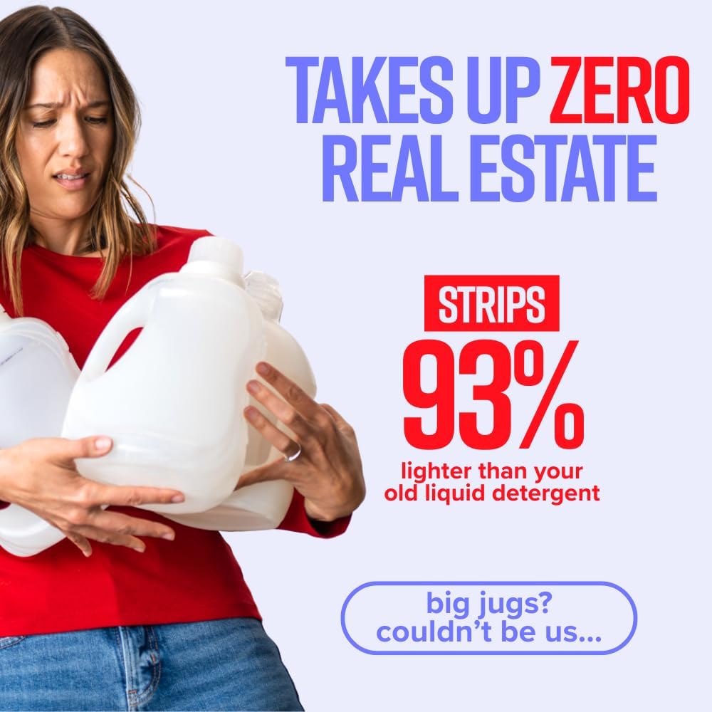- Eco-Friendly & Compact – At just a fraction of the weight and size of liquid detergent, STRIPS reduce shipping emissions, save storage space, and eliminate single-use plastic bottles.