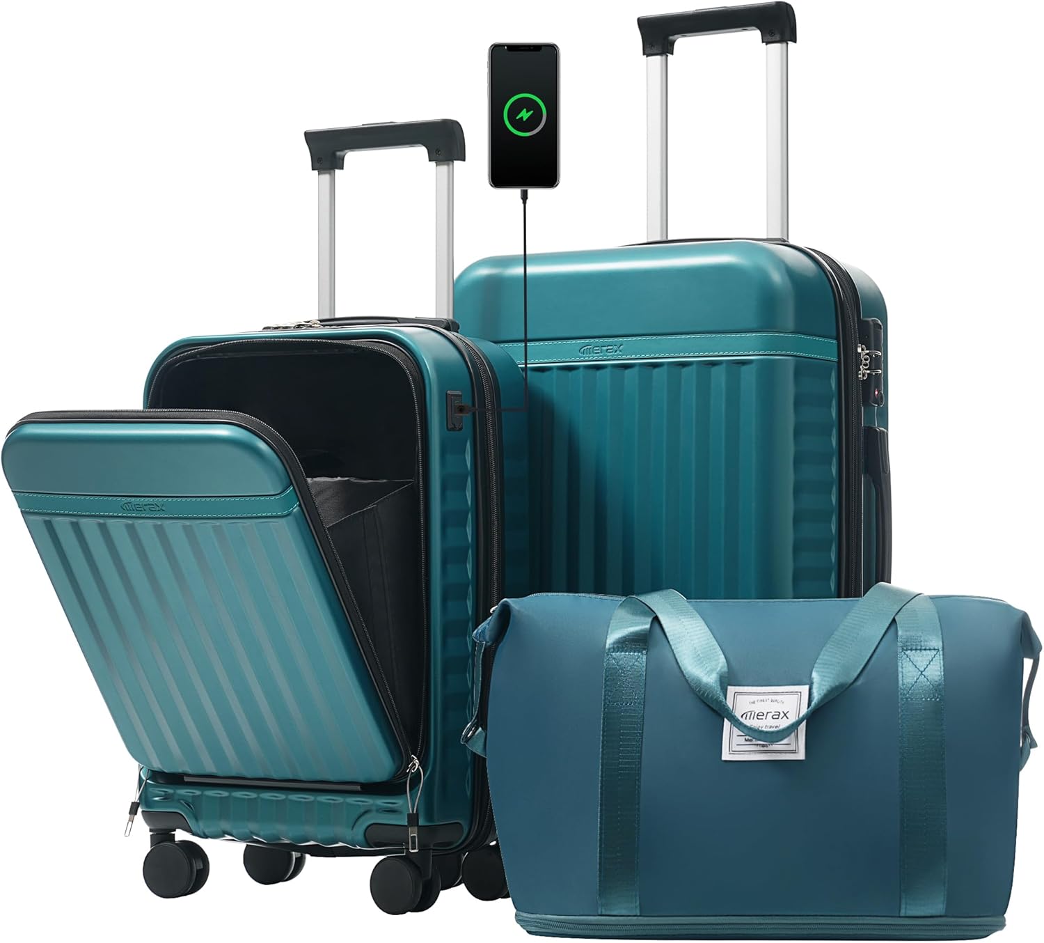 Merax Luggage Sets 2 Piece Front Opening, Hardside Lightweight Carry on Suitcase with USB Port,Durable Expandable Luggage with Bags Spinner Wheels and TSA Lock,Dark Green