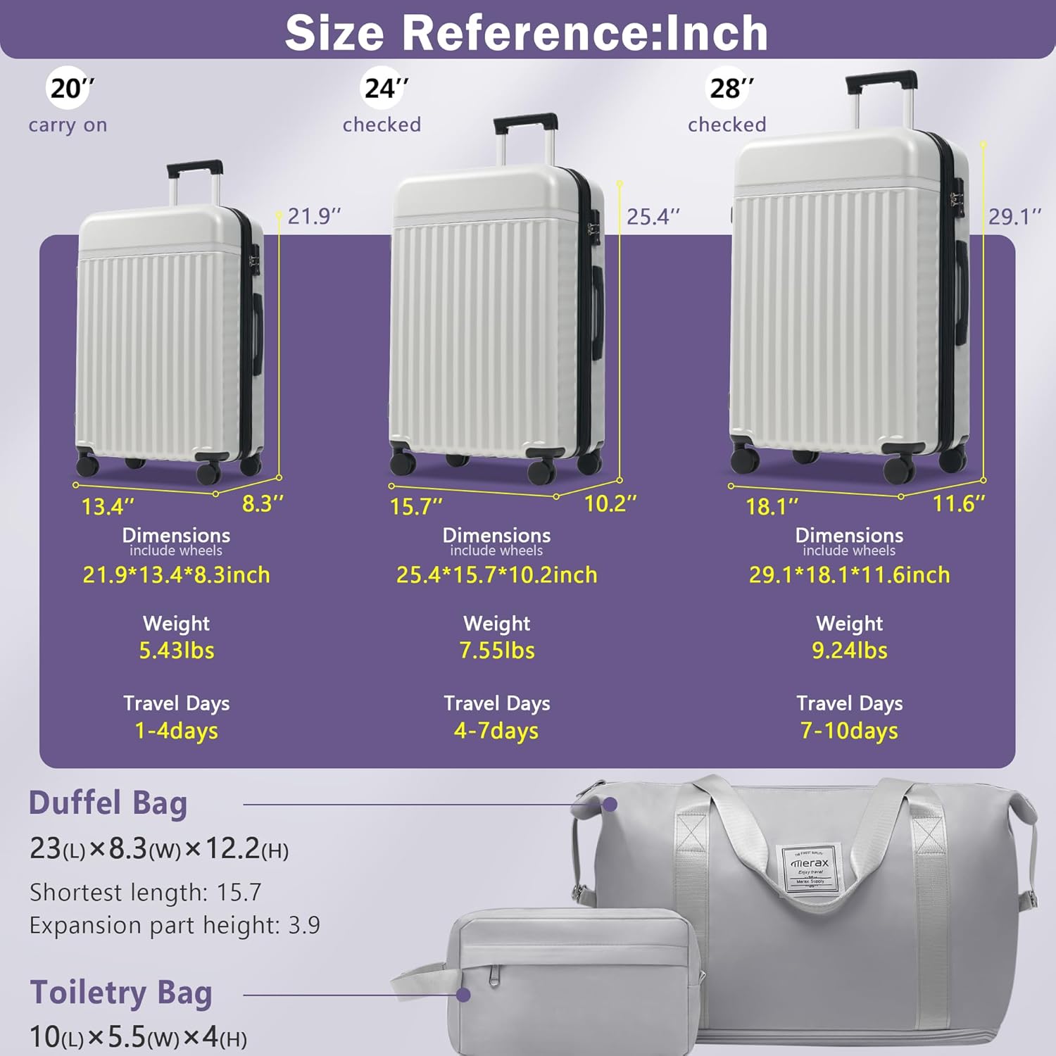 Merax 3 Piece Luggage Sets, Hardside Lightweight Carry on Suitcase,Durable Expandable Luggage with Travel Bags Spinner Wheels and TSA Lock,White Grey