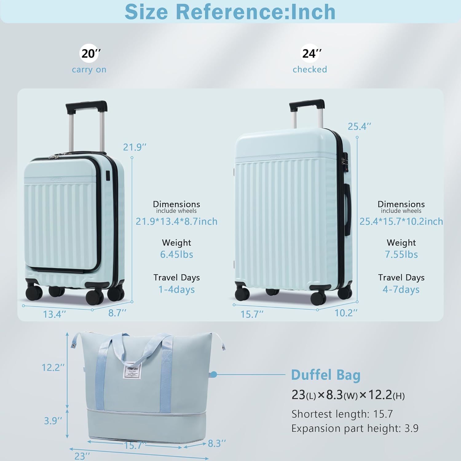 - 2 Piece Luggage Sets:The luggage set of 2 pieces offers 20" carry on luggage, 24" medium checked luggage, and 1 duffel bag,can be nested together for easy storage.Note: Only 20 inches is front opening.