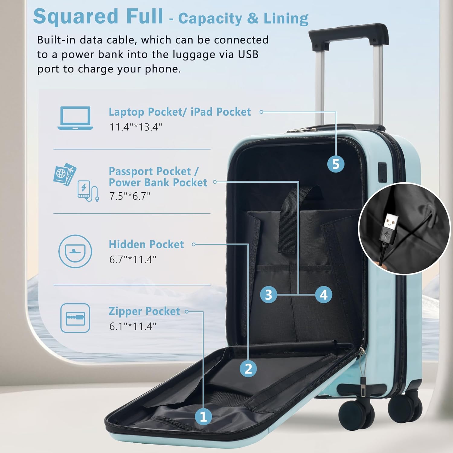 Merax Luggage Sets 2 Piece Front Opening, Hardside Lightweight Carry on Suitcase with USB Port,Durable Expandable Luggage with Bags Spinner Wheels and TSA Lock,Light Blue