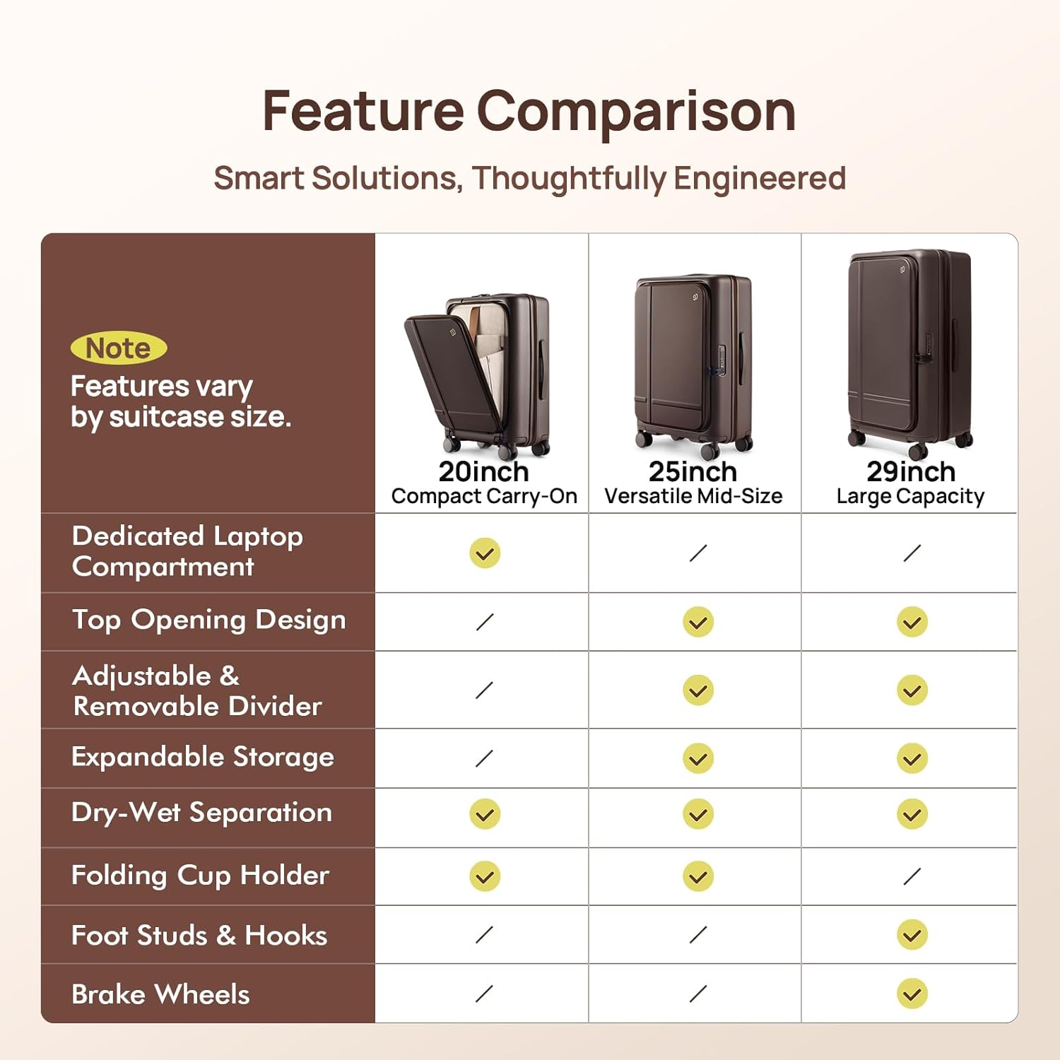 - 【Thoughtful Details & Travel Convenience】The interior is equipped with a removable divider and dry-wet separation to keep your belongings organized and protected. Exterior foot studs & hooks are included for secure stacking and easy handling. Please note: 29-inch version does not include a cup holder, prioritizing streamlined storage and handling for extended travels.