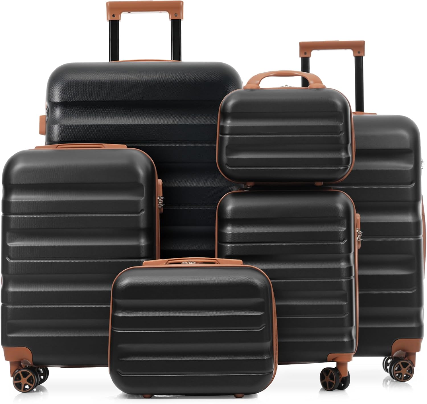 Merax Luggage Set 6 Piece, Hardshell ABS Suitcases with 8 Silent Spinner Wheels, Durable and Lightweight Travel Luggage for Family Trips, Black Brown