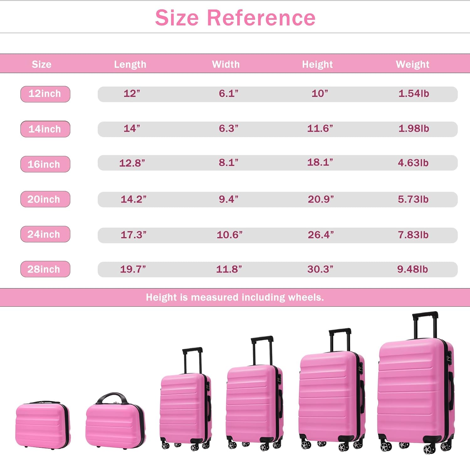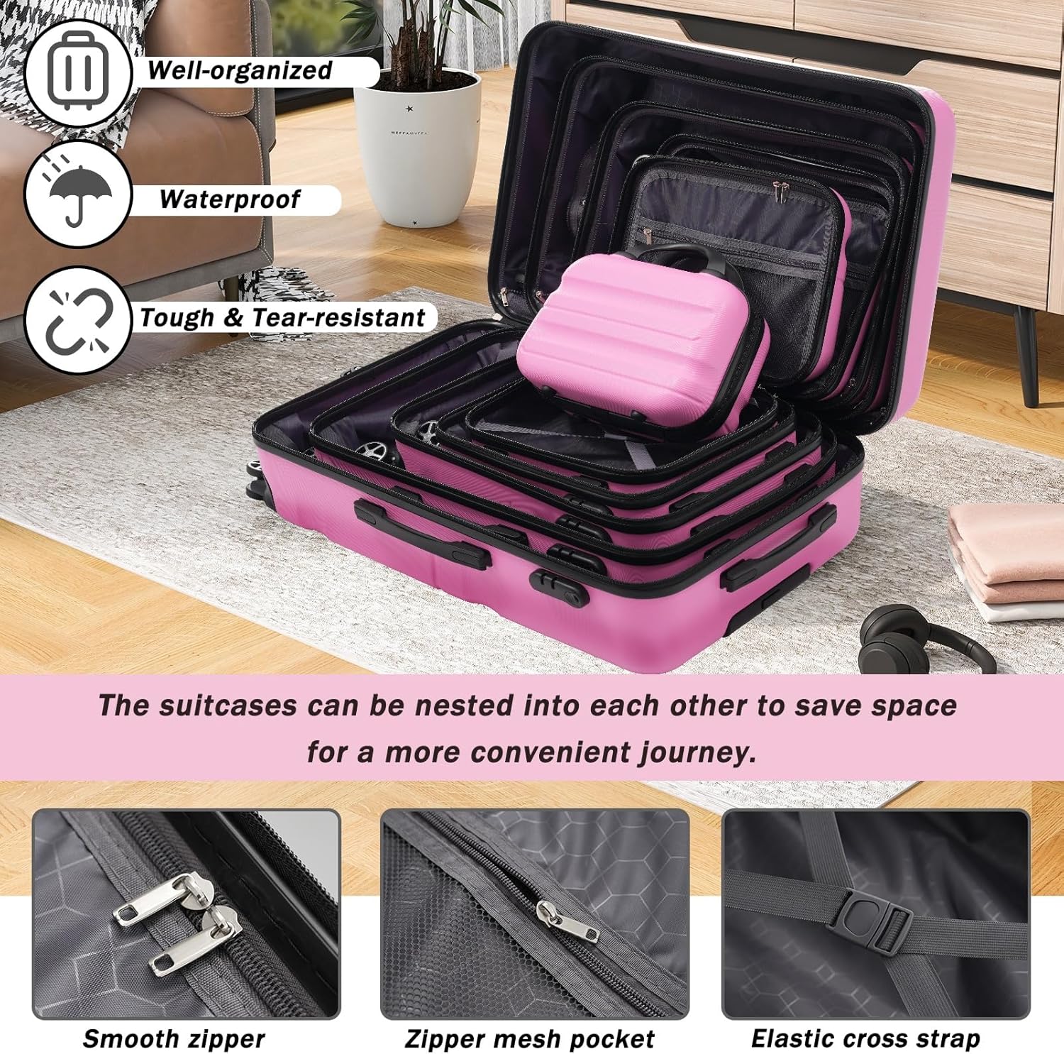 Merax Luggage Set 6 Piece, Hardshell ABS Suitcases with 8 Silent Spinner Wheels, Durable and Lightweight Travel Luggage for Family Trips, Pink