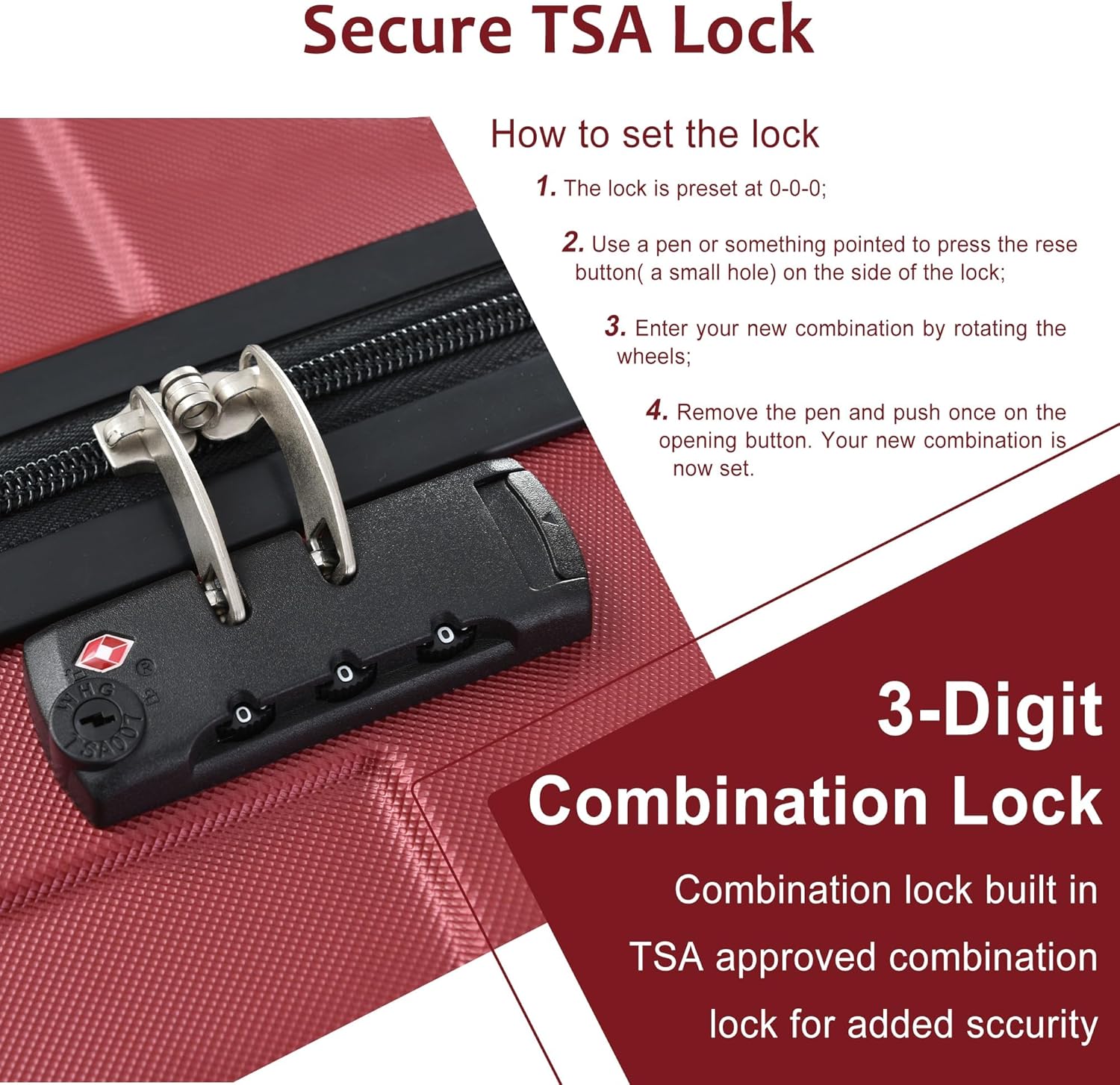 - TSA-Approved Lock: Allows only security agents to inspect your luggage with a master key without causing damage, giving you peace of mind during travel.