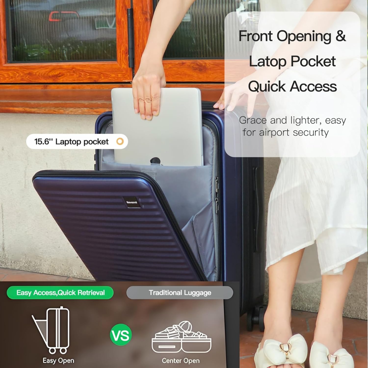 - Convenient Front Pocket Design: This carry-on luggage with laptop compartment features a 15.6" laptop sleeve, mesh organizer, and document pocket—all located in the front pocket, there is no need to open the main compartment during security screening. make your journey safe and convenient. (When the front pocket is full, the main compartment space will be smaller)