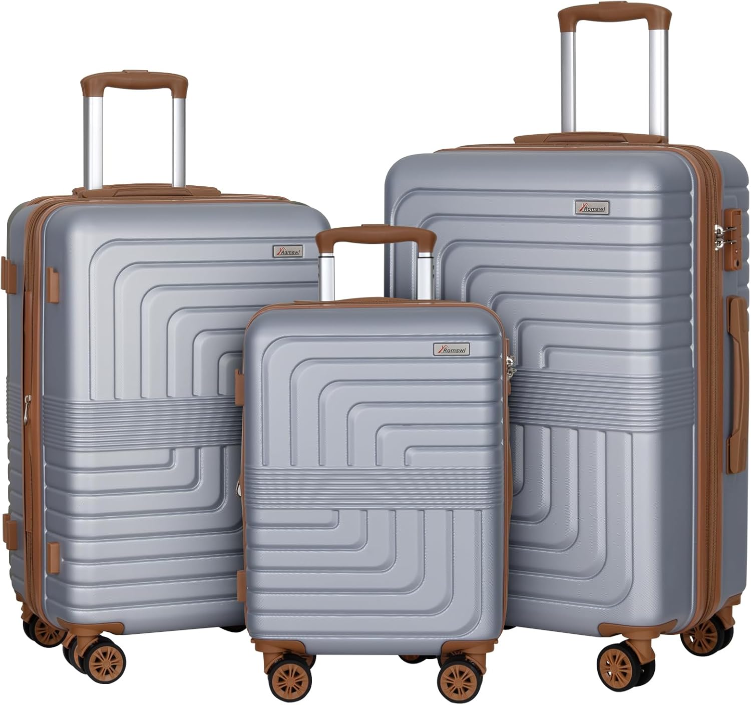 Romswi Luggage Sets 3 Piece Expandable PC+ABS Suitcases, Durable Hardshell Lightweight Suitcase Set with TSA Lock Dual Spinner Wheels, 20/24/28 Inch, Silver