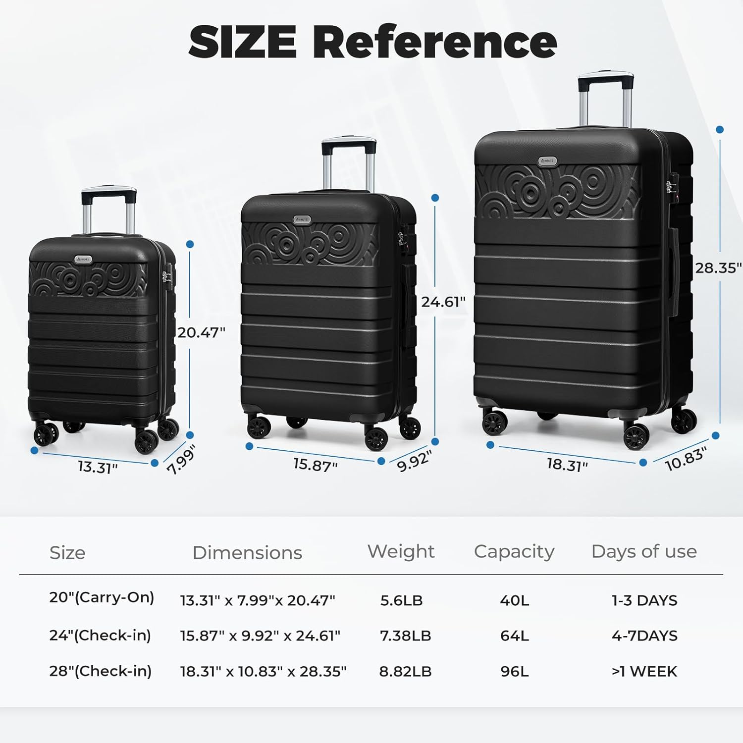 - [Check in Luggge] The large-capacity 24-inch checked suitcase meets your travel and storage needs.Size:15.87*9.92*24.61 IN, 7.38LB. Capacity: 65L.