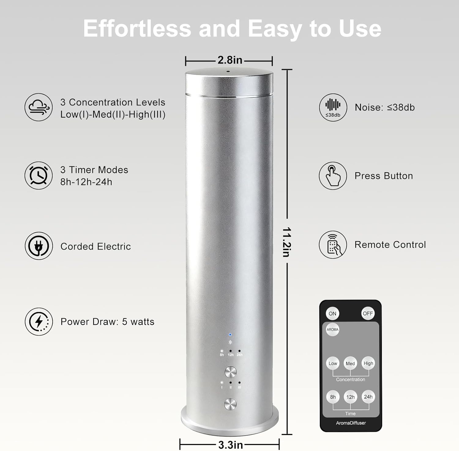 Waterless Essential Oil Diffuser Large Room Scent Diffuser for Home, Office, Hotel and Spas - Aromatherapy Diffuser Fragrance Oil Machine, Remote Control, Timer, Silver