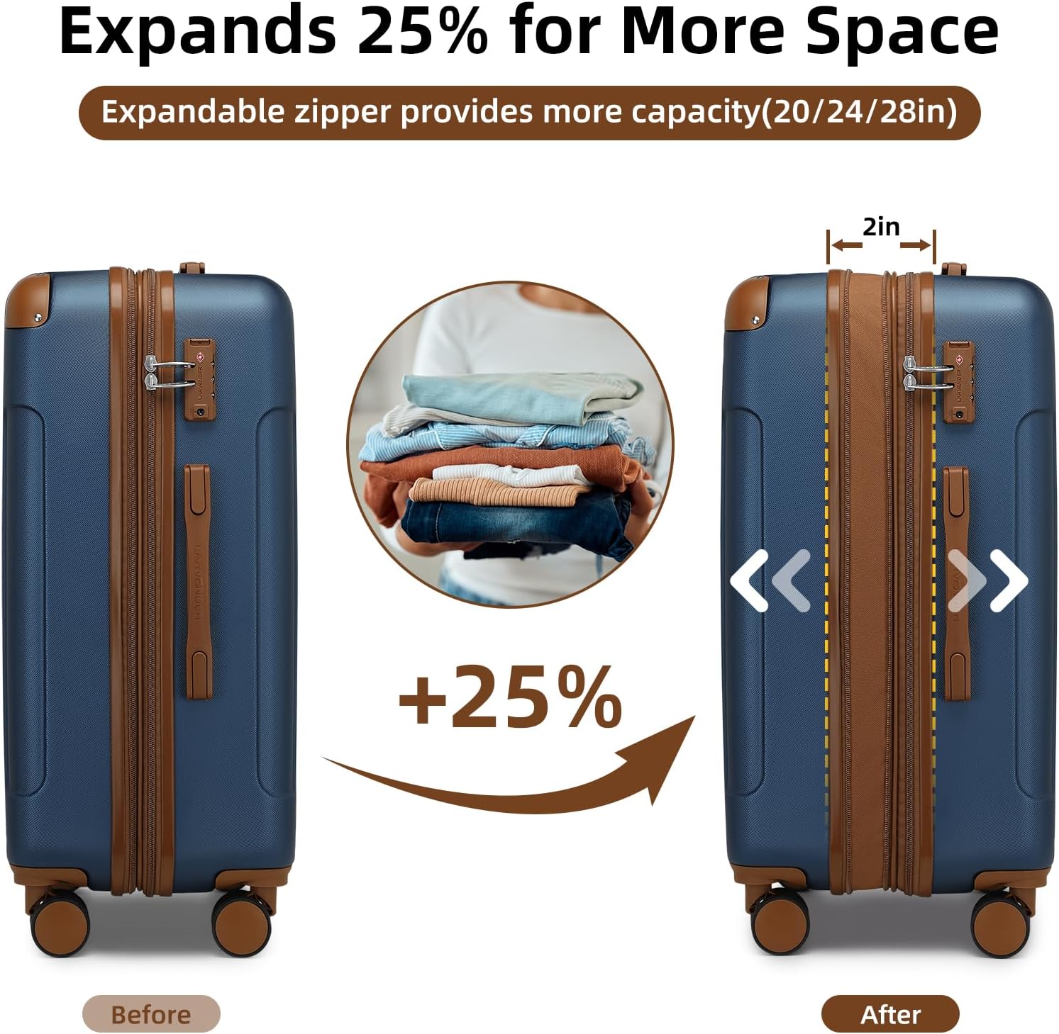 - Expandable Suitcase Sets: 6 piece luggage set includes 18"/20" carry on suitcase, a 24'' checked suitcase, a 28'' large suitcase, a weekender duffel bag and a toiletry bag. 20/24/28 inch luggage and duffel bag expand 25% for more spaces